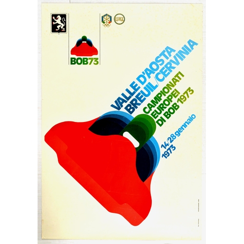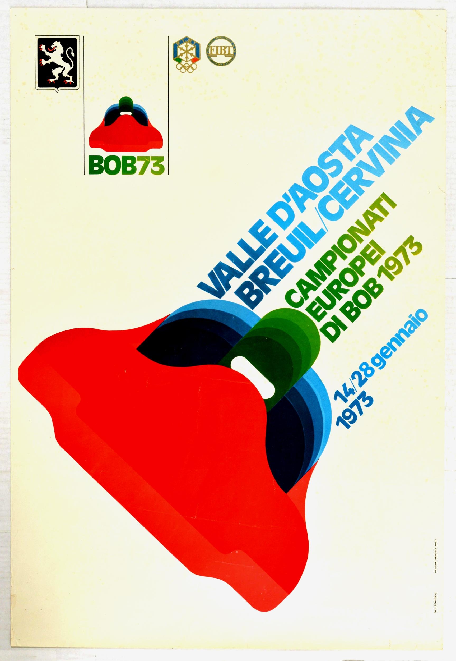 Sport Poster Valle DAosta Italy Winter Sport World Bobsleigh. Original vintage sport advertising poster titled in Italian Valle D'Aosta Breuil Cervinia Campionati Europei Di Bob 1973 - European Bobsleigh Championships 1973, with an artwork featuring a minimalist two dimensions flat graphic design of a bobsleiger in a red bobsleigh. The event was held from 14 to 28 January 1973, in Aosta, in the Italian Alps. Good condition, staining, creasing, tears, pinholes. Country of issue: Italy, designer: Unknown, size (cm): 96x65, year of printing: 1973.