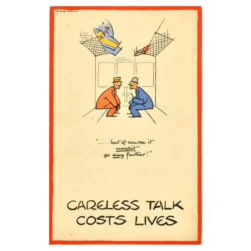 . Original vintage World War Two poster by the notable British cartoonist and illustrator Fougasse (Cyril Kenneth Bird; 1887-1965), one of the posters from the popular Careless Talk Costs Lives wartime propaganda series issued by the Ministry of Information - "But of course it mustn't go any further!" Great image of two men talking in their train carriage with the legs of Hitler and Goering peeking out from the overhead luggage rack above them. Good condition, creasing, fold, staining. Country of issue: UK, designer: Fougasse (Cyril Kenneth Bird), size (cm): 32x20.5, year of printing: 1940s.