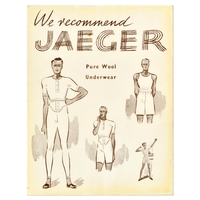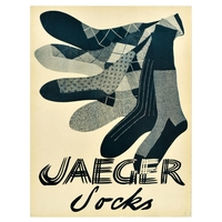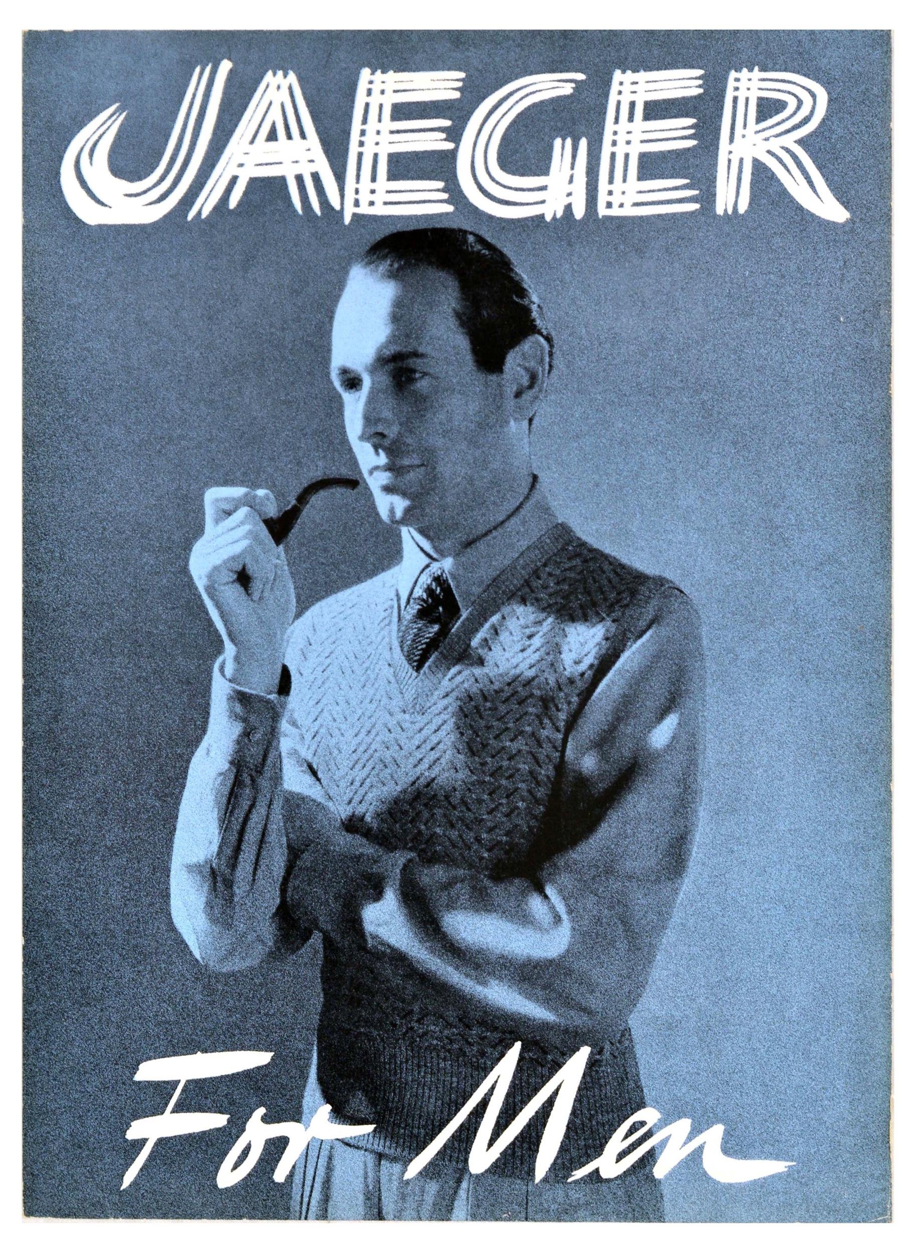 Advertising Poster Jaeger For Men Fashion Apparel. Original vintage advertising poster - Jaeger For Men - featuring an illustration of a gentleman in a shirt with a tie and a knitted vest holding his smoking pipe. Founded in 1884 by British businessman Lewis Tomalin, Jaeger is a British fashion brand and retailer of women's and men's wear. Very good condition, minor staining, minor creasing. Country of issue: UK, designer: Unknown, size (cm): 34x26, year of printing: 1930s.