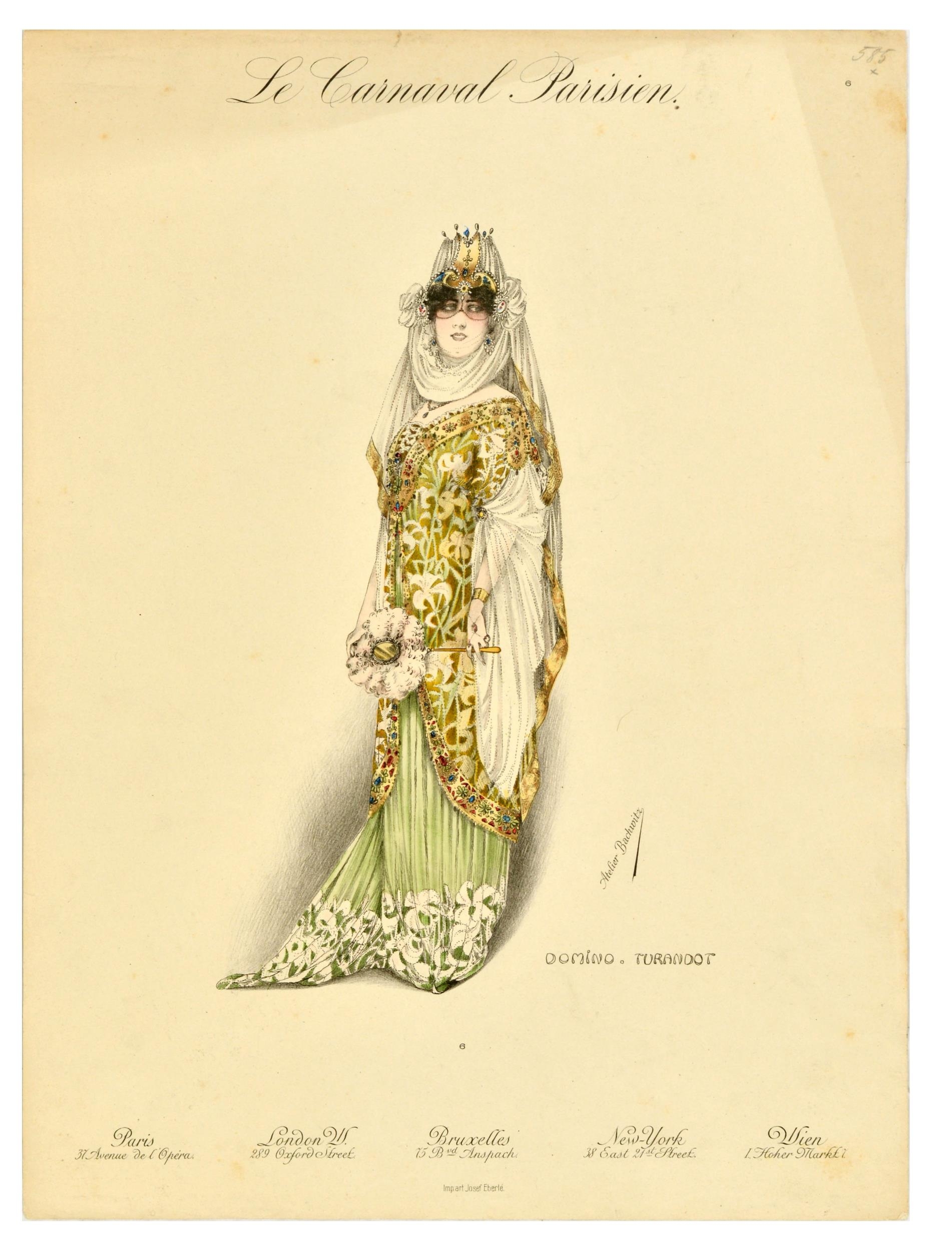 Advertising Poster Atelier Bachwitz Domino Turandot Carnaval. Original vintage advertising poster Le Carnaval Parisien / The Parisian Carnival featuring an image titled Domino Turandot, depicting a lady in an oriental style, floral fancy-dress or masquerade costume and a jewel-adorned face cover. Founded in 1898, Atelier Bachwitz was a Viennese publishing house known for producing high-end fashion portfolios, such as Le Carnaval Parisien and Chic Parisien, which featured hand-coloured lithographs of contemporary French fashion and fancy-dress costumes. Fair condition, staining, tears, creasing, pencil markings. Country of issue: France, designer: Atelier Bachwitz, size (cm): 42x31, year of printing: 1920s.