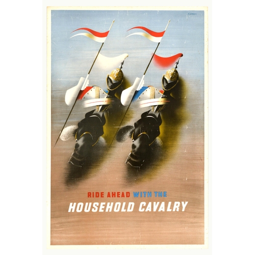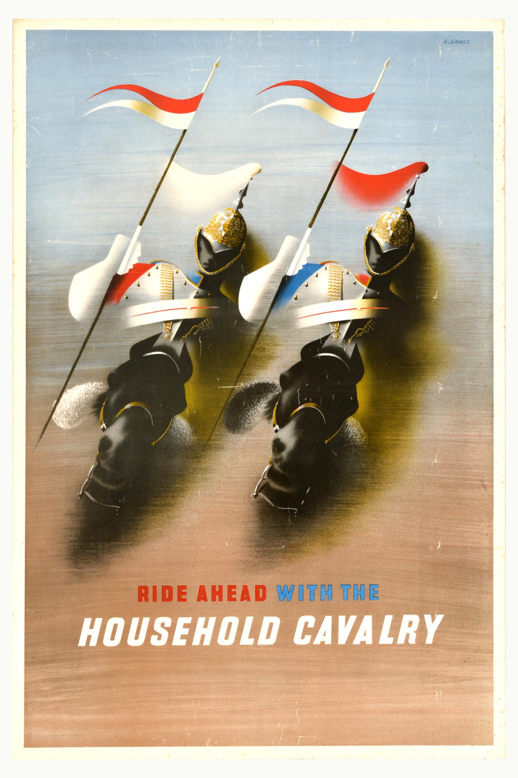 Propaganda Poster Household Cavalry Abram Games Royal Horse Guards Modernist. Original vintage army recruitment poster - Ride Ahead With The Household Cavalry - featuring a fantastic illustration by the notable British graphic designer Abram Games (Abraham Gamse; 1914-1996) of two members of the Household Cavalry on horseback riding diagonally towards the viewer, each figure highly stylised with their faces and horses in black shadows, their white gloved hands silhouetted and their uniforms and flags simplified with blurred red and white plumes on their helmets depicting speed and movement, and the text below in red, white and blue letters. The Household Cavalry (HCav) is made up of the two most senior regiments of the British Army, The Life Guards and The Blues and Royals (Royal Horse Guards and 1st Dragoons). These regiments are divided between the Household Cavalry Regiment stationed at Wing Barracks in Wiltshire and the ceremonial mounted unit, the Household Cavalry Mounted Regiment, garrisoned at Hyde Park Barracks (Knightsbridge Barracks) in London. The Household Cavalry is part of the Household Division and is the King's official bodyguard. Although the Household Cavalry Regiment is armoured, it is not part of the Royal Armoured Corps. Abram Games OBE, RDI (29 July 1914 � 27 August 1996) was a British graphic designer. The style of his work � refined but vigorous compared to the work of contemporaries � has earned him a place in the pantheon of the best of 20th-century graphic designers. In acknowledging his power as a propagandist, he claimed, "I wind the spring and the public, in looking at the poster, will have that spring released in its mind." Because of the length of his career � over six decades � his work is essentially a record of the era's social history. Some of Britain's most iconic images include those by Games. An example is the "Join the ATS" poster of 1941, nicknamed the "blonde bombshell" recruitment poster. His work is recognised for its "striking colour, bold graphic ideas, and beautifully integrated typography". Fair condition, foxing, tears, creasing, crease marks, staining. Country of issue: UK, designer: Abram Games, size (cm): 77x51, year of printing: 1950s.