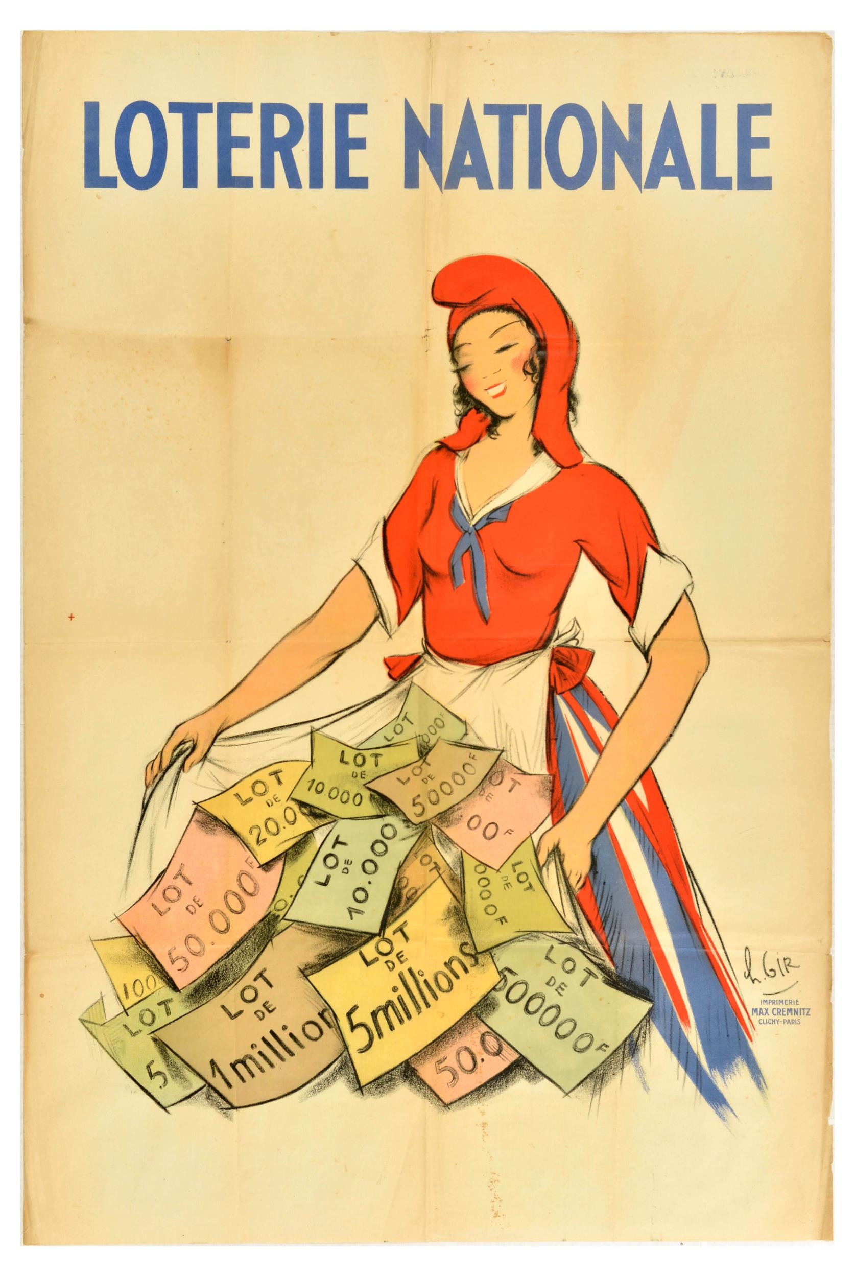 Advertising Poster Loterie Nationale Dress French National Lottery Marianne. Original vintage advertising poster for the French National Lottery / Loterie Nationale featuring a lady wearing a red, blue and white dress with an apron comprised of lottery tickets. Bold blue lettering above. Fair condition, folds, tears, creasing, staining, foxing, browning, small paper losses. Country of issue: France, designer: Gir Charles, size (cm): 120x81, year of printing: 1930s.