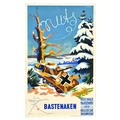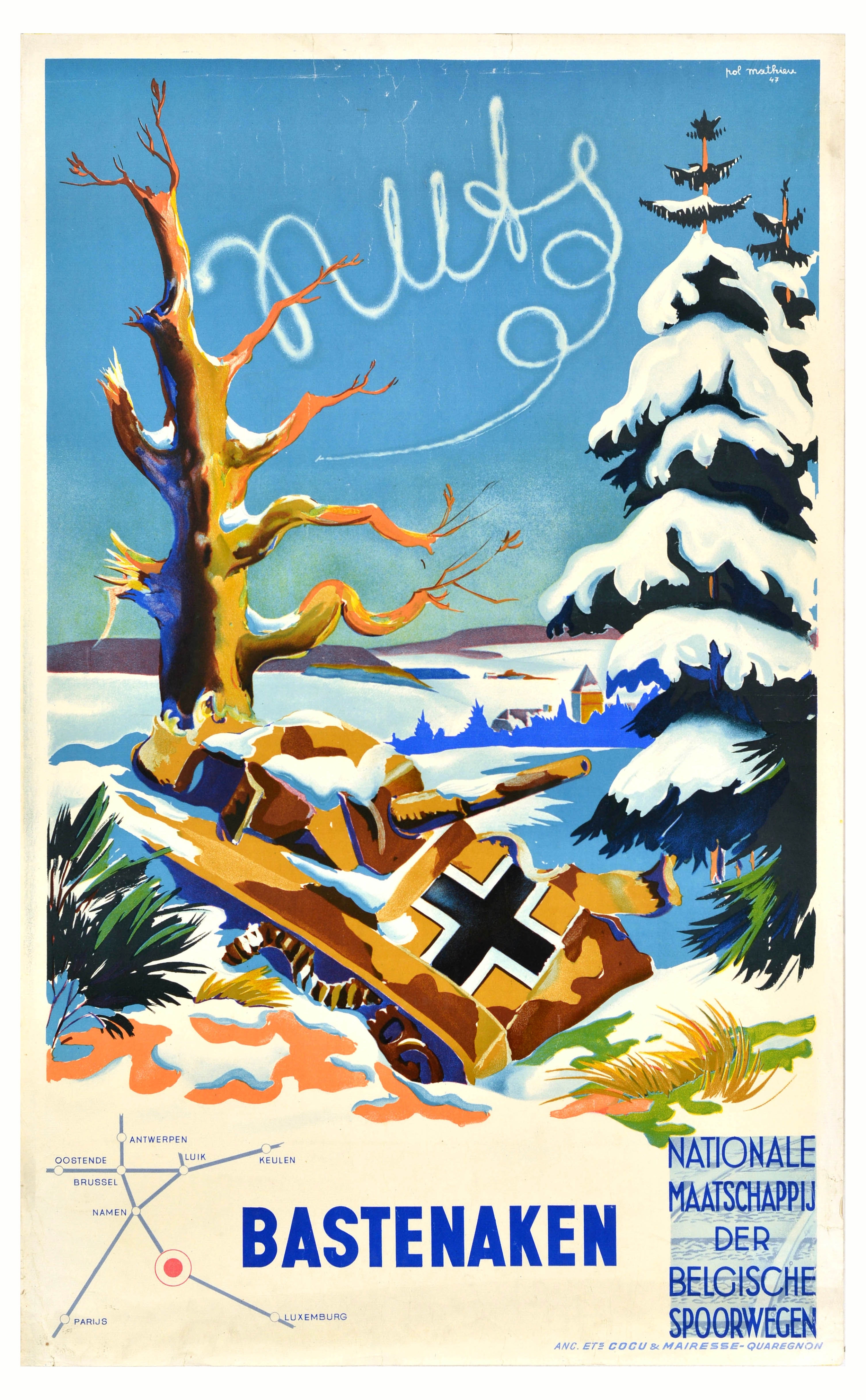 Travel Poster Bastogne Belgian National Railway Nazi Tank. Original vintage post-WWII railway travel poster for Nationale Maatschappij der Belgische Spoorwegen / Belgian National Railway Company. Colourful illustration of a discarded German Nazi tank covered in snow in a trench by a war-torn tree with a snow-topped tree on the side, village and hills in the distance, and a route map below marking Bastogne Anvers Ostende Brussels Namur Liege Cologne Paris and Luxembourg next to the SNCF Belges train track logo. Artwork by the painter Pol Francois Mathieu (1895-1979). Printed by Cocu & Mairesse, Quaregnon. Good condition, creasing, tears, staining, pinholes, small paper losses on edges. Country of issue: Belgium, designer: Pol Mathieu, size (cm): 100x62, year of printing: 1947.