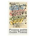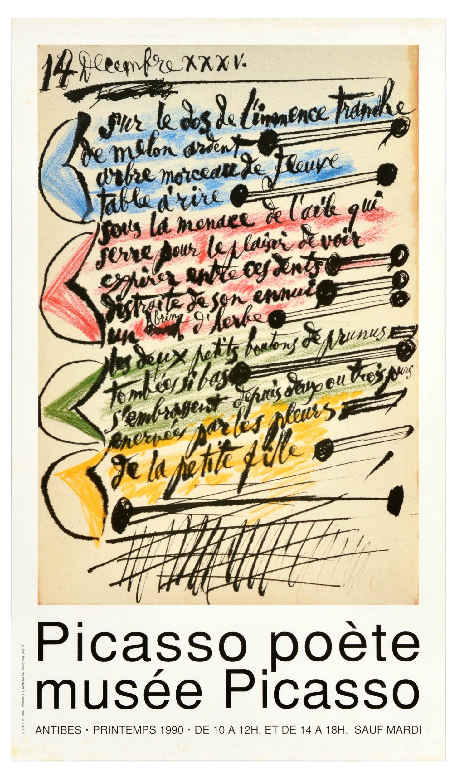 Art Exhibition Poster Picasso Poetry Poet Poem. Original vintage art advertising poster for an exhibition - Picasso Poet - Which took place at the Picasso Museum in Antibes in the spring of 1990 - Artwork by Pablo Picasso (1881-1973) features poetry written out in black handwriting over a multicoloured background. Very good condition, creasing, staining. Country of issue: France, designer: Pablo Picasso , size (cm): 72x42, year of printing: 1990.
