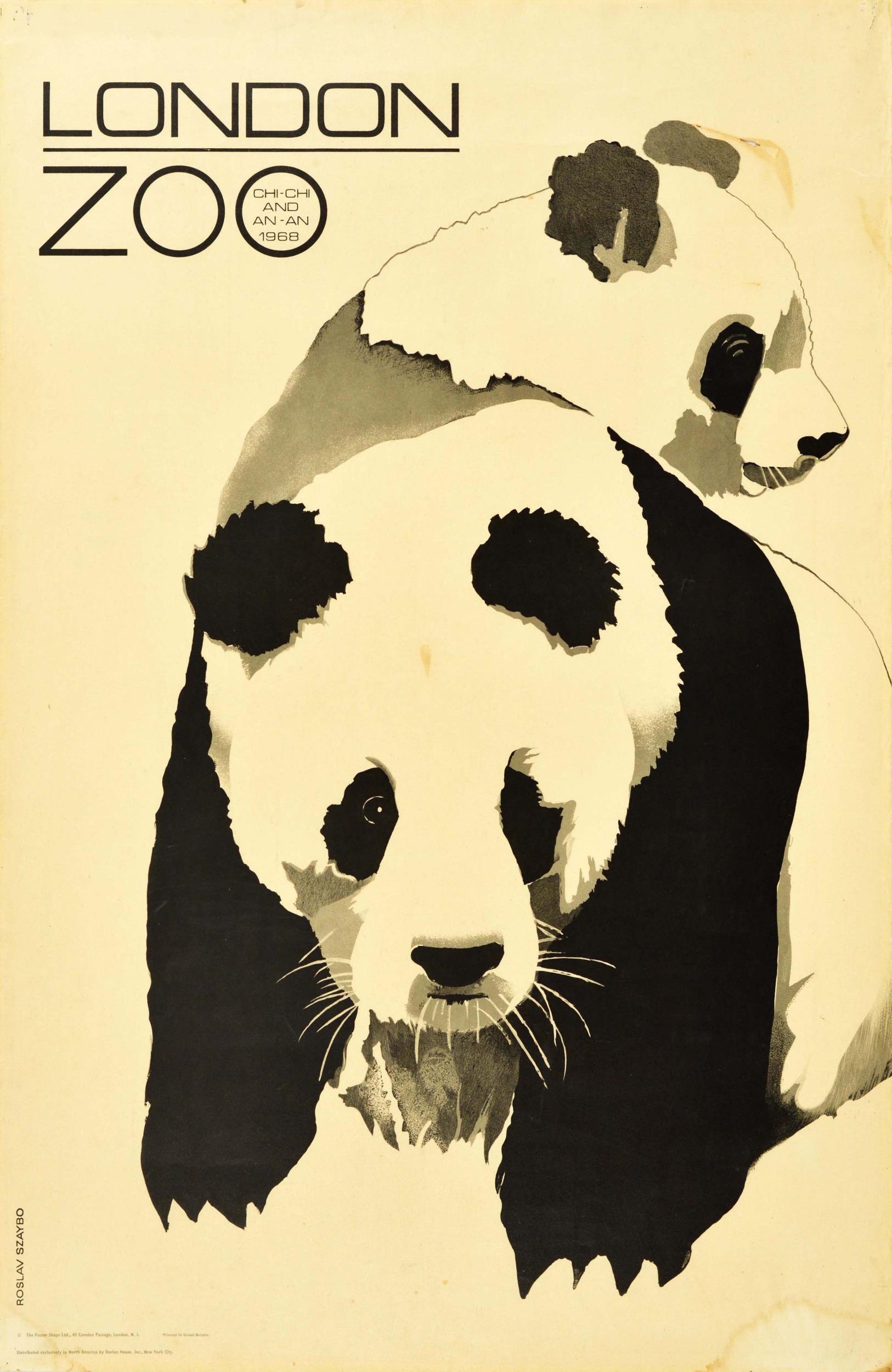 Travel Poster London Zoo Panda Chi Chi And An An. Original vintage advertising poster for London Zoo featuring a great image by the Polish designer Roslav Szaybo (1933-2019) of two pandas with the title above - London Zoo Chi Chi and An An 1968 - the panda's name and date in the O of the word Zoo. Born in China and moved to London in 1958, Chi Chi (1954-1972) is London Zoo's famous and most loved giant panda who was the inspiration for the original black and white World Wildlife Fund WWF logo designed by Peter Scott. Attempts to get Chi Chi and An An from Moscow Zoo to mate in 1968-1969 failed. Distributed exclusively in North America by Darien House Inc New York City. Printed in Great Britain. Fair condition, creasing, tears, staining, pinholes. Country of issue: UK, designer: Roslav Szaybo, size (cm): 102x66, year of printing: 1968.