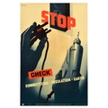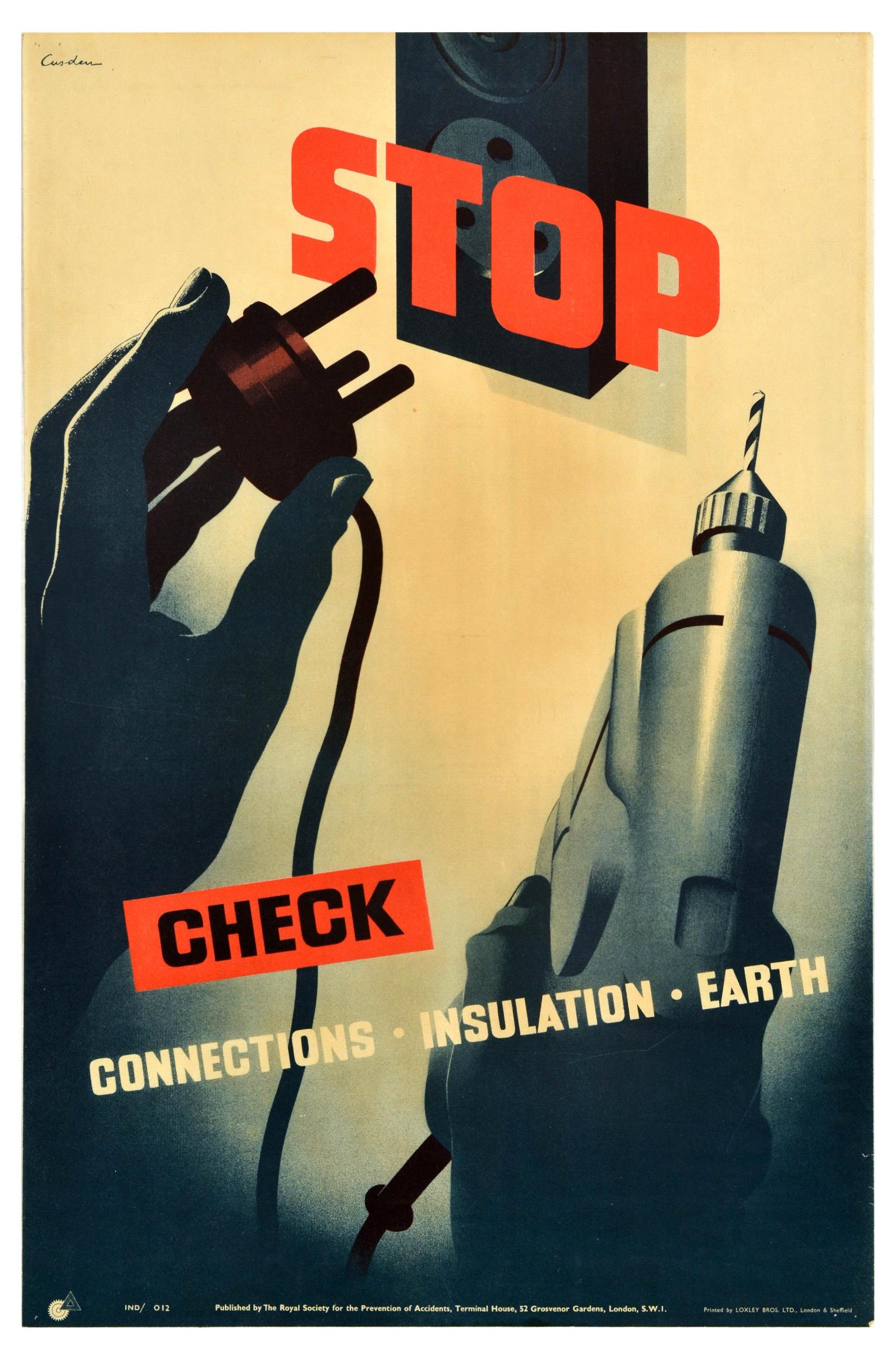 Propaganda Poster Check Connections Insulation Earth Cusden. Original vintage safety poster published by the Royal Society for the Prevention of Accidents ROSPA - Stop Check Connections Insulation Earth - Design by Leonard Cusden (1898-1979) features a hand plugging in a drill with bold red lettering blocking the plug socket. Printed by Loxley Bros Ltd. Good condition, creasing, tears, staining, pinholes. Country of issue: UK, designer: Leonard Cusden, size (cm): 75x49, year of printing: 1940s.