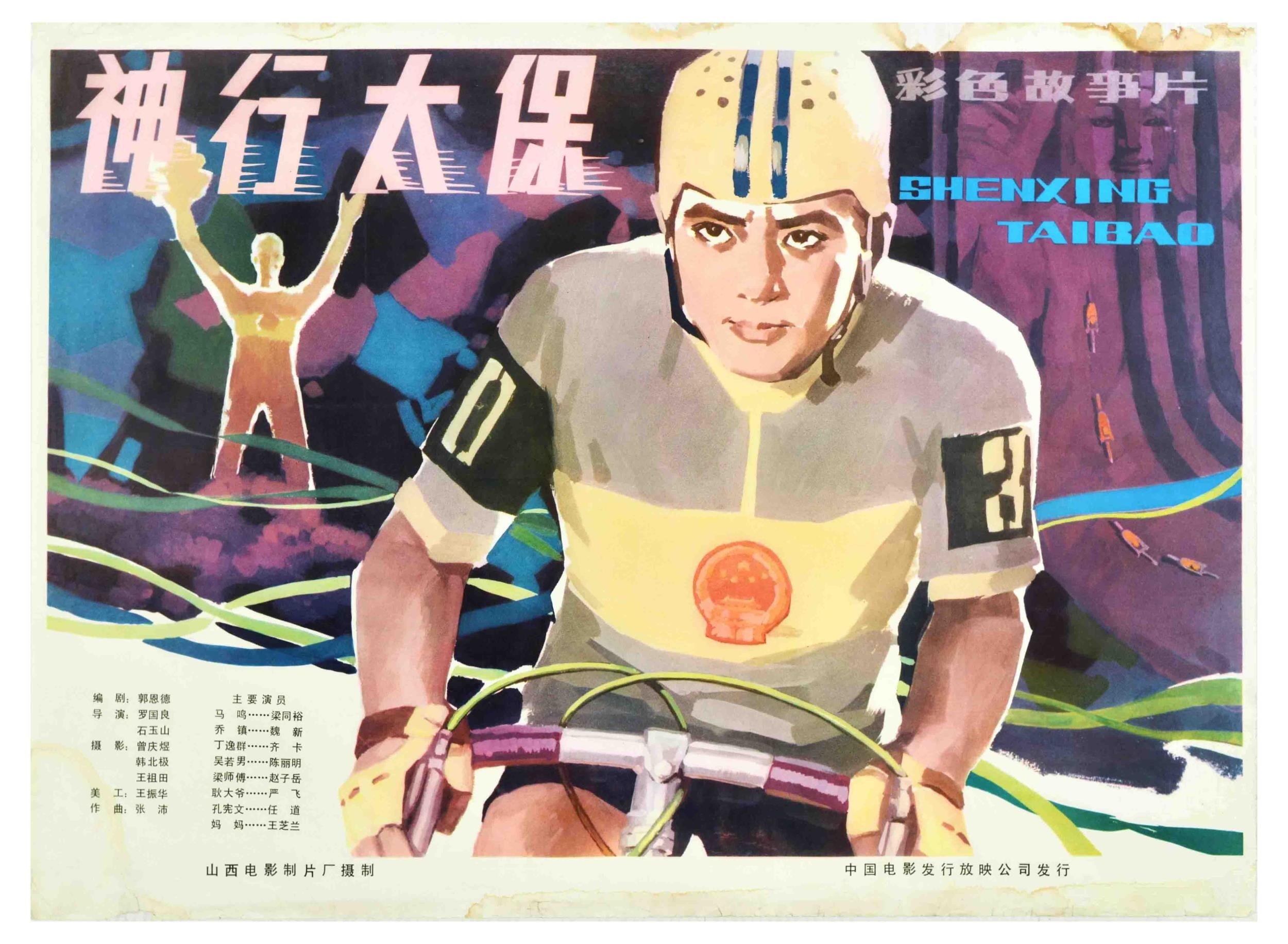 Movie Poster Shenxing Taibao Bicycle Racing Cycling Bike. Original vintage movie poster for Shenxing Taibao, a 1980s Chinese sports film directed by Luo Guoliang and Shi Yushan, the poster features a cyclist on a bicycle with a background of a victorious athlete and view of cyclists from above. Horizontal. Fair condition, tears, creasing, paper losses, staining, Country of issue: China, designer: Unknown, size (cm): 78x105, year of printing: 1980s.