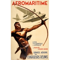Advertising Poster Air France In All Skies Art Deco Valerio. Original vintage travel poster - Dans Tous Les Ciels Air France / In All Skies - featuring a stunning Art Deco design by Roger de Valerio (1886-1951) depicting a propeller plane flying at speed with a lady at the front, like a ship's figurehead, holding up the iconic Air France winged horse Pegasus logo. Good condition, minor staining, small tears on margins. Country of issue: France, designer: Roger de Valerio, size (cm): 50x31, year of printing: 1935.