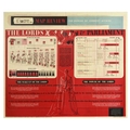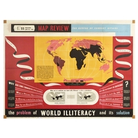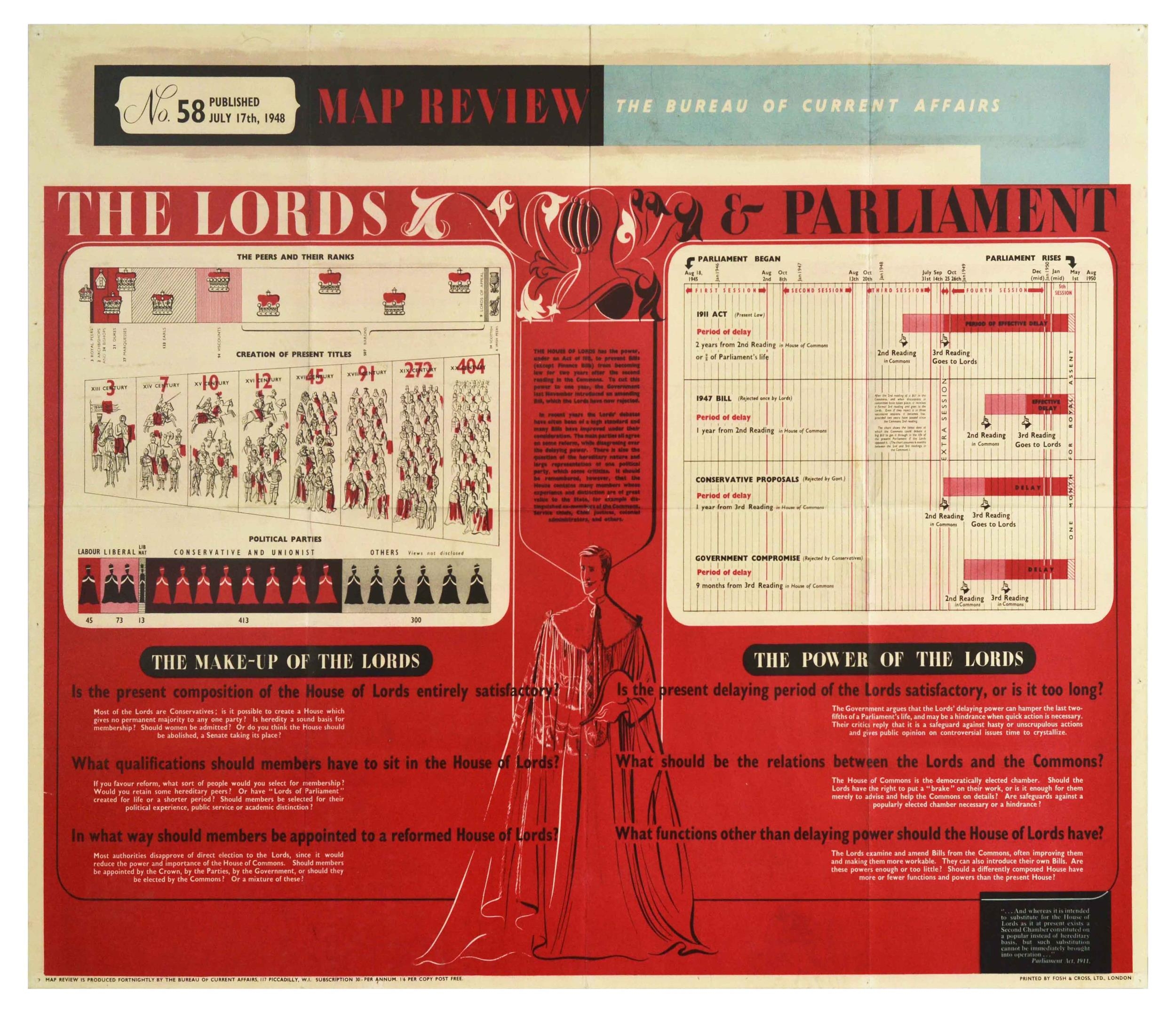 Propaganda Poster Map Review 58 House of Lords Parliament. Original vintage propaganda poster Map Review No 58 Published July 17th 1948, featuring an article titled The Lords & Parliament, featuring statistics and introduction on the Peers and their ranks, creation of present titles, political parties, the make-up and the power of the Lords, set over red background with an ornate decoration and stylised lettering in title. Issued by The Bureau of Current Affairs, Carnegie House, 117 Piccadilly, W.1. Printed by Fosh & Cross, Ltd, London. Horizontal. Good condition, folds, creasing, minor paper loss on folds, minor staining, pin holes. Country of issue: UK, designer: Unknown, size (cm): 76x102, year of printing: 1948.