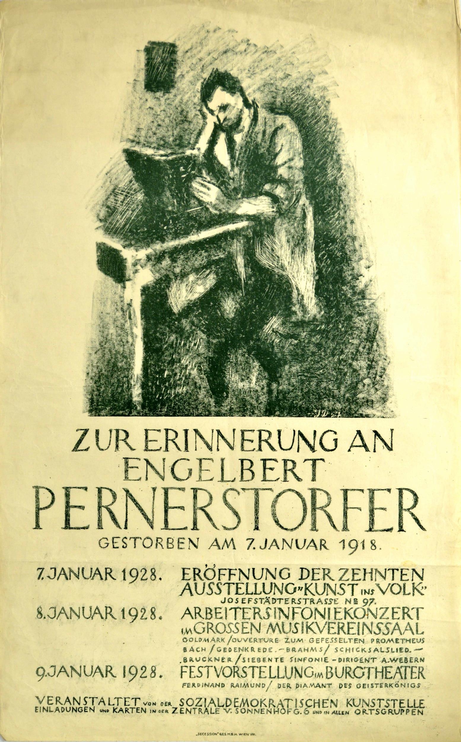 Advertising Poster In Memory Of Engelbert Pernerstorfer. Original vintage advertising poster for a series of commemorative events - Zur erinnerung an Engelbert Pernerstorfer / In memory of Engelbert Pernerstorfer - featuring a monotone drawing of the Austrian politician and journalist Engelbert Pernerstorfer (1850-1918) sitting at a table reading a book and resting his head on his hand with the stylised lettering and event information text below, organised by the Social Democratic Art Agency / Sozialdemokratischen Kunststelle to mark the tenth anniversary of his death from 7-9 January 1928. Good condition, folds, creasing, staining, tears. Country of issue: Austria, designer: J.D., size (cm): 84.5x53, year of printing: 1928.