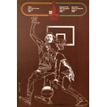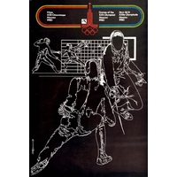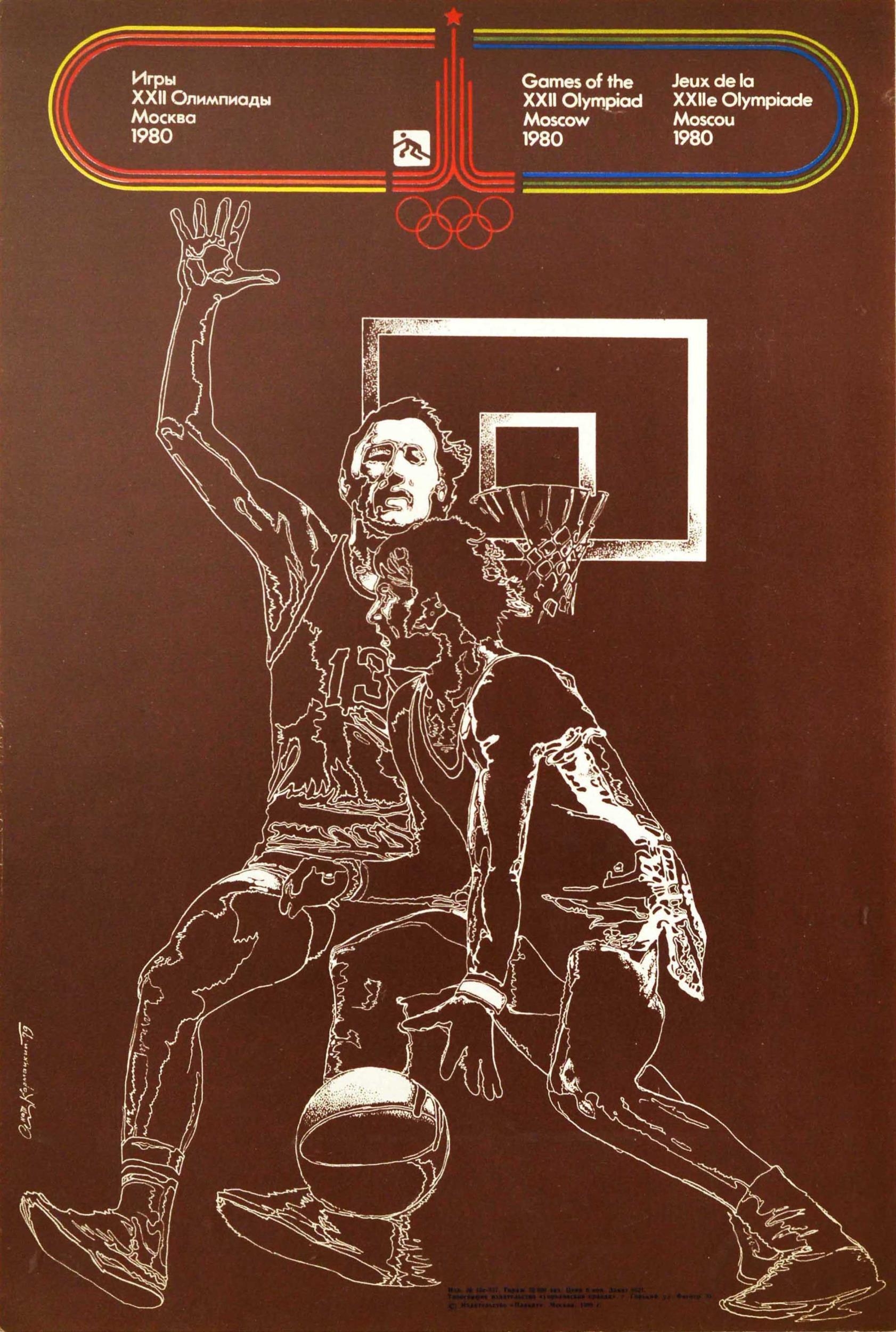 Sport Poster Moscow Olympics 1980 Games Basketball. Original vintage sport poster for the 1980 Olympic Games held in Moscow Russia featuring a dynamic design of a basketball event showing a player with the ball in the foreground trying to score a goal with a player from the other team holding his arm up in defence in front of the basketball hoop in the background, the basketball event symbol and Moscow Olympic logo and rings in red above, the title in Russian, English and French within an Olympic coloured lines border - Games of the XXII Olympiad Moscow 1980. Very good condition, minor creasing. Country of issue: Russia, designer: Karmatskiy, size (cm): 48x32, year of printing: 1980.