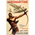 Advertising Poster Aeromaritime West Coast Africa Albert Brenet. Original vintage travel poster for Aeromaritime Cote Occidentale d'Afrique de Dakar a Pointe Noir Services Aeriens de Chargeurs Reunis / West Coast of Africa from Dakar in Senegal to Pointe Noir in the Congo Chargeurs Reunis Air Service featuring a dynamic design by Albert Brenet (1903-2005) depicting an African tribesman shooting a bow and arrow in line with a propeller plane flying in the sky above. Aeromaritime was founded in 1935 by the Chargeurs Reunis shipping company to develop the company's air transport services to Africa. Printed by Mont-Louis, Clermont-Ferrand Paris. Good condition, staining, restored tears, backed on linen. Country of issue: France, designer: Albert Brenet, size (cm): 98x62, year of printing: 1937.