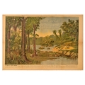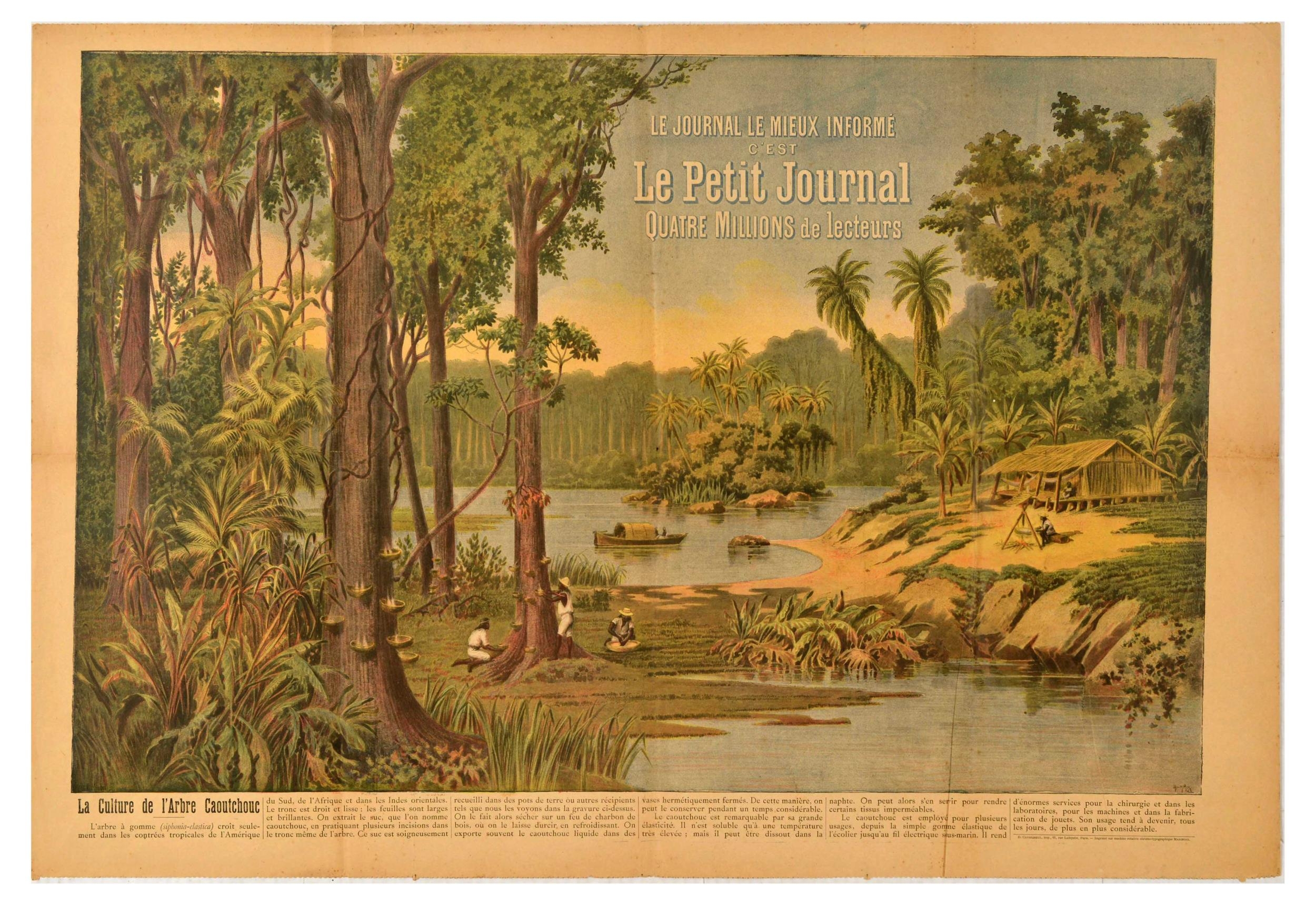 Lithograph Poster Rubber Tree Cultivation Le Petit Journal. Original vintage lithograph newspaper supplement titled La Culture de l'Arbre Caoutchouc / The Cultivation of the Rubber Tree issued by Le Petit Journal - The best informed newspaper with four million readers - Artwork by Henri Meyer (1841-1899 depicts a tropical scene with people collecting sap from rubber trees near a body of water with a boat and a small hut nearby. The text describes the harvesting taking place in South America, Africa and East India. Horizontal. Fair condition, folds, creasing, staining, tears, serrated edge, small paper losses, browning. Country of issue: France, designer: Henri Meyer, size (cm): 62x90, year of printing: 1900s.