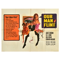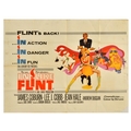 Movie Poster In Like Flint James Bond 007 Spy Parody . Original vintage movie poster for the 1967 American spy-fi comedy film In Like Flint - directed by Gordon Douglas and starring James Coburn as master spy Derek Flint alongside Lee J. Cobb,Jean Hale and Andrew Duggan - Artwork by the American illustrator Bob Peak (1927-1992) features the main character wearing a tuxedo and holding a lighter and martini like 007 while standing behind a blonde lady sitting backwards in a chair with colourful scenes from the film in the background. In Like Flint is a sequel to Our Man Flint and parodies the James Bond film series. It follows Derek Flint, who faces off against a cabal of women plotting to rule the world. Tagline reads; 'Flint's Back!... In Action...In Danger...In Fun' Printed by Lonsdale and Bartholomew. Horizontal. Good condition, pinholes, paper losses, folds, tears, staining, creasing. Country of issue: UK, designer: Bob Peak, size (cm): 76x102, year of printing: 1967.