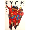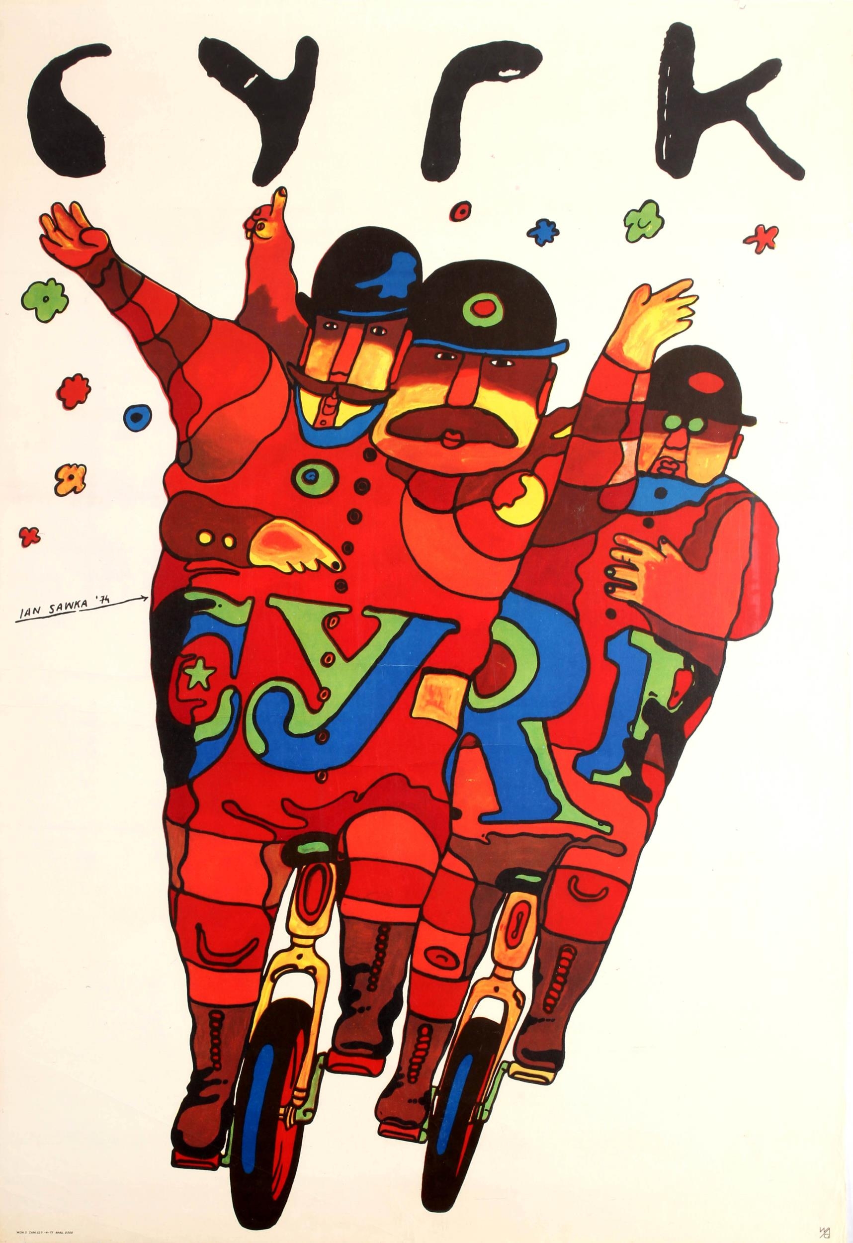 Advertising Poster Cyrk Unicycle Acrobats Sawka Polish Design. Original vintage advertising poster promoting the Circus - Cyrk - featuring a colourful illustration by the Polish artist Jan Sawka (1946-2012) showing three acrobats wearing bowler hats and bright costumes riding small yellow unicyles against a white background with the title in stylised black letters above flower shaped confetti. Good condition, creases and folds, small tears on margins. Country of issue: Poland, designer: Jan Sawka, size (cm): 96.5x67, year of printing: 1974.