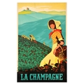 Travel Poster Champagne Wine France Vineyard Grapes. Original vintage travel poster for La Champagne featuring a great illustration by Adrien Senechal (1895-1974) of ladies in yellow dresses with bonnet hats and red scarves picking grapes in a vineyard with a lady in the foreground smiling towards the viewer and holding a basket of grapes in one arm, the rolling green hills leading to a windmill in the distance and the title text in bold lettering below. The historical province of Champagne in northeast France is best known as the Champagne wine region for the sparkling white wine drink that bears its name. Good condition, restored tears, restored creasing, minor staining, backed on linen. Country of issue: France, designer: Adrien Senechal, size (cm): 99x62, year of printing: 1937.