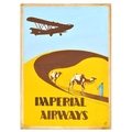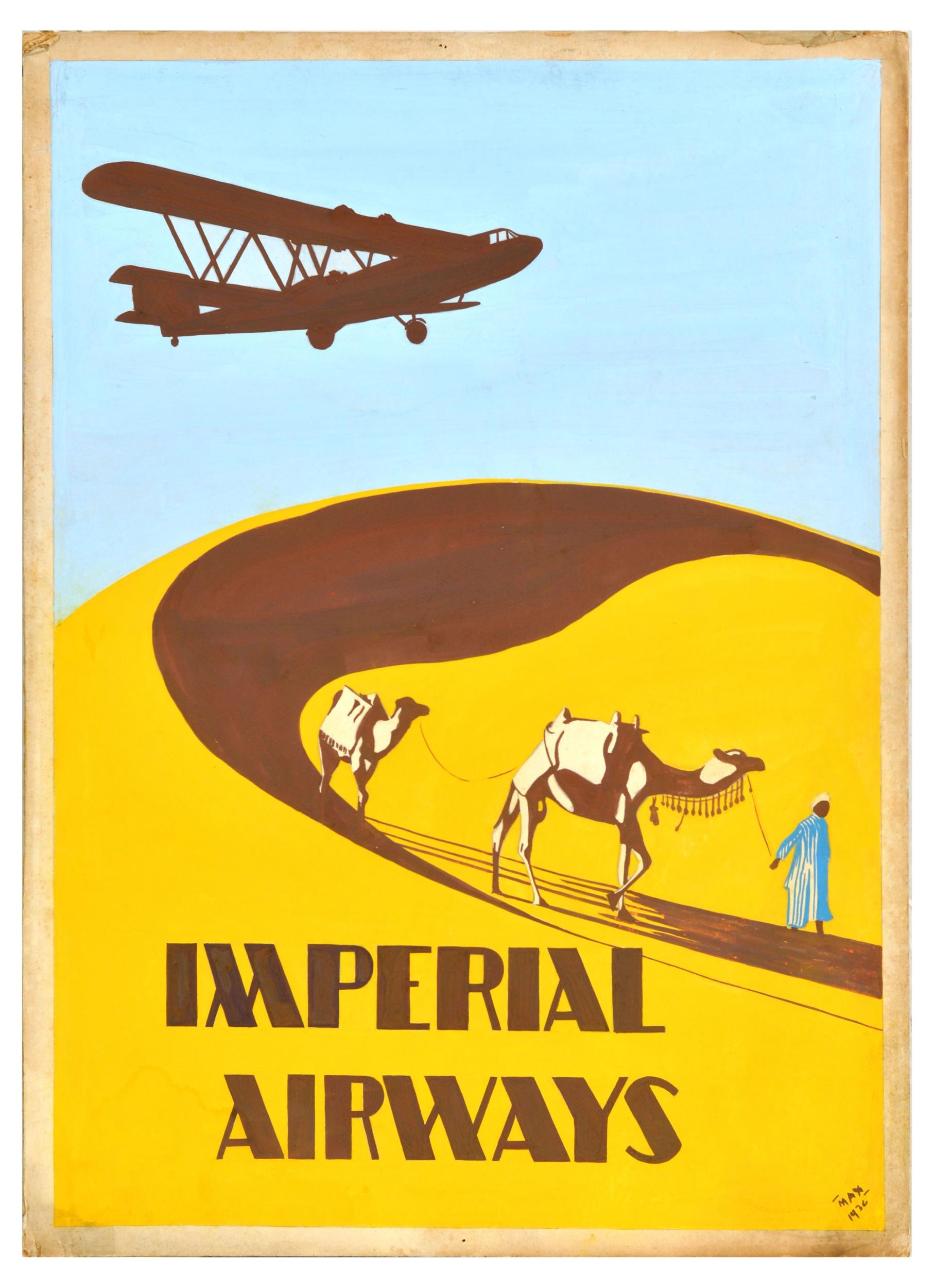 Hand Drawn Poster Design Imperial Airways Desert Camel. Original hand drawing design by Max advertising Imperial Airways featuring an image of a plane flying above a desert, with a man walking camels down the yellow sand, throwing brown shade on the dunes. Good condition, staining, backed on board, staining on board, bumps and tears on board. Country of issue: UK, designer: Max, size (cm): 56x40.5, year: 1936.