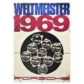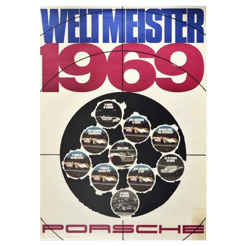 Sport Poster Porsche Car Racing World Champion. Original vintage motorsport poster for Porsche Champion / Weltmeister 1969 celebrating their car racing victories featuring a great design by Erich Strenger (1922-1993) resembling a shooting target in a gun range with photos in the gunshot holes showing the winning Porsche cars from ten races - 12 Hours of Sebring 1000 Chilometri di Monza 1000 Kilometer Nurburgring Targa Florio 6 Hours of Brands Hatch 6 Hours of Watkins Glen 24 Hours of Daytona 1000 Kilometres de Spa Les 24 Heures Du Mans Grosser Preis von Osterreich - captioned on each with the bold title lettering above and below. Large size. Good condition, tears, staining. Country of issue: Germany, designer: Erich Strenger, size (cm): 119x84, year of printing: 1969.