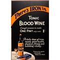 Advertising Poster Tonic Blood Wine Health Supplements Fitness. Original vintage medicinal drink advertising poster: There's Iron in Tonic Blood Wine - enough essence to make one pint only costs 1'/ - a daily dose of iron means good health physical fitness and bubbling vitality - restores the appetite and strength - makes new blood. Colourful illustration featuring a bottle of home made Tonic Blood Wine on a table with a glass and a packet of essence against a black background with the stylised lettering above and below. Very good condition, restored folds and minor tears on margins, backed on linen. Country of issue: UK, designer: Unknown, size (cm): 84x52.5, year of printing: 1920s.