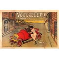 Advertising Poster Voiturette CLC Early Classic Car Belle Epoque France. Advertising Poster Voiturette CLC Early Classic Car Belle Epoque France. Original antique early car advertising poster for the Voiturette CLC miniature automobile Moteur sans soupapes / Engine without valves featuring a fantastic illustration showing a lady wearing a fashionable dress and hat climbing into a red Voiturette car, with a smiling face formed by the company letters CLC at the front, next to the driver in uniform in a picturesque old town setting with fields leading to a bright yellow sky in the distance, the stylised title text in white and black letters above and address below - 165 Avenue d'Italie Paris. The French automobile manufacturer CLC Cockborne, Lehucher et da Costa was based in Paris and assembled these classic cars from 1911 to 1913. The French automobile manufacturer and inventor Leon Bollee (1870-1913) registered the Voiturette name (a diminutive from the French word Voiture for Car or Automobile) for his new motor tricycle in 1895 and the popular term was used during the early years of the motor industry to describe small cars (including Renault's first car the Renault Voiturette / Renault Little Car 1898-1903). Large size. Horizontal. Fair condition, restored paper losses, restored tears, restored fold, staining, backed on linen. Country of issue: France, designer: C Vrey, size (cm): 80x120, year of printing: 1912.