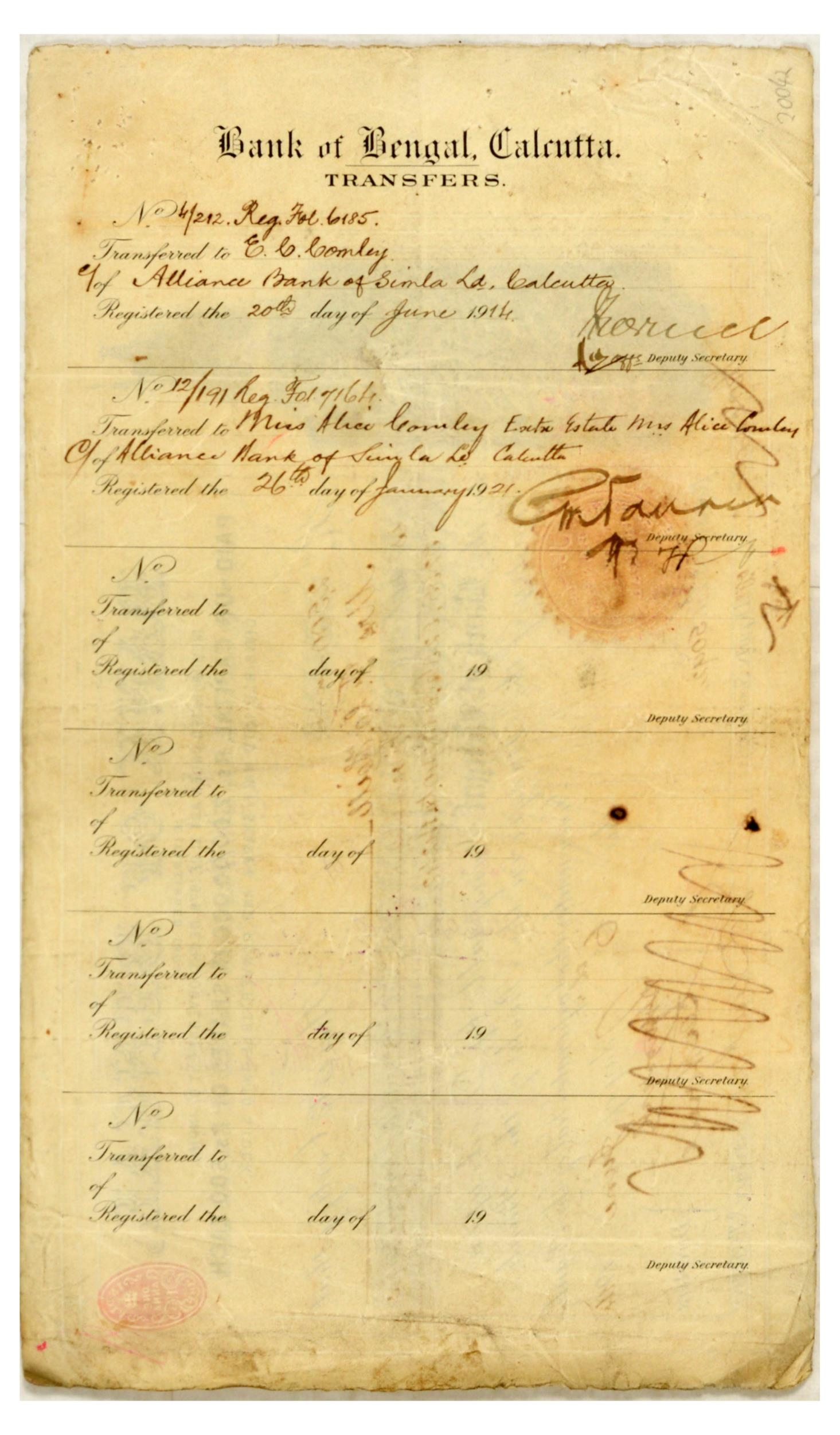 Advertising Poster Bank of Bengal Shares Calcutta India. Original antique Bank of Bengal shares certificate issued to Mrs F. Hill on 6 June 1914, featuring stylised writing and embossed stamps, the reverse features the record of share transfers. Founded in 1806 as the Bank of Calcutta, renamed in 1809 to The Bank of Bengal, it was one of three presidency banks that merged in 1921 to form the Imperial Bank of India, which was the precursor to the modern-day State Bank of India. Fair condition, creasing, tears, staining, pinholes, paper losses, ink stamp, wax stamp, writing in ink, double sided. Country of issue: India, designer: Unknown, size (cm): 20.5x34.5, year of printing: 1914.