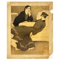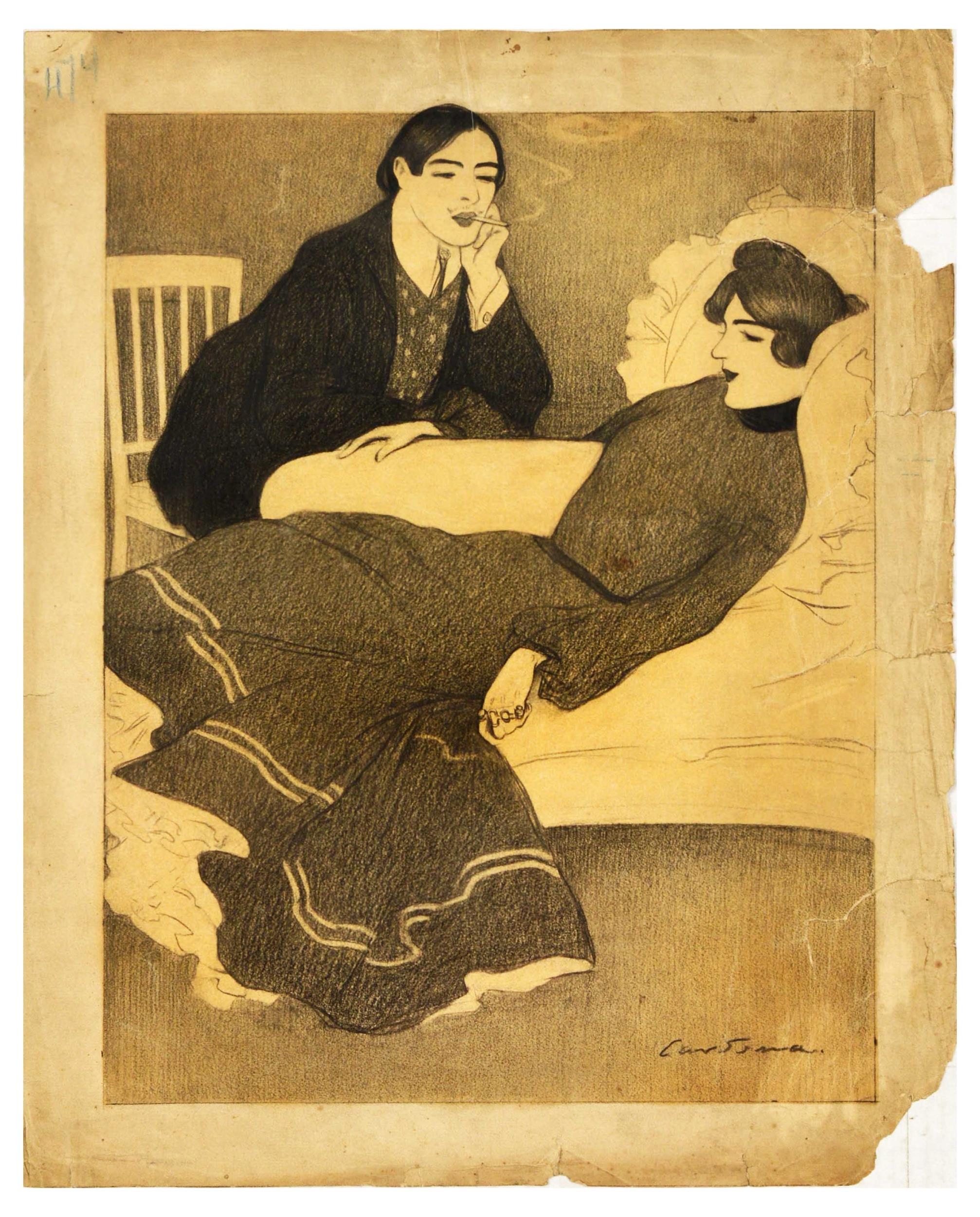 Original Drawing Belle Epoque Joan Cardona Llados Man Smoking Lady Bed. Original charcoal and pencil drawing on paper featuring an illustration of a lady laying down in bed and a gentleman smoking at her side. Signed. Joan Cardona i Llados (June 30, 1877 � September 16, 1958) was a Spanish painter and illustrator associated with the Modernist movement. Born in Barcelona, he studied at the Escola de la Llotja, where he developed his skills in painting and drawing. While he initially focused on landscape painting, evolving from Impressionism to Post-Impressionism, he gained greater recognition as a draftsman and illustrator. Cardona was heavily influenced by French artists such as Henri de Toulouse-Lautrec and Th�ophile Steinlen, which is reflected in his realistic yet expressive style. In 1900, he moved to Paris, where he became well known for his depictions of female figures, both Parisian and Spanish, in a manner reminiscent of Hermenegildo Anglada Camarasa. In the French capital he formed a group with the best illustrators of the time, such as Cappiello, Sem, Steinlen and Roubille. His work was featured in numerous publications, including Catalan magazines such as Hispania, El Gato Negro, and La Ilustraci� Catalana, as well as French (Le Rire, La Vie Parisienne) and German (Jugend, Simplicissimus) periodicals. His illustrations captured the vibrant and sometimes bohemian life of the early 20th century. Poor condition, paper losses, several large tears, staining, foxing, pinholes, blue pencil mark on top left corner. Country of issue: Spain, designer: Joan Cardona Llados, size (cm): 54x44, year of printing: 1900s.