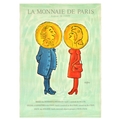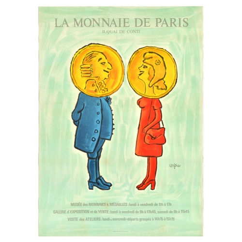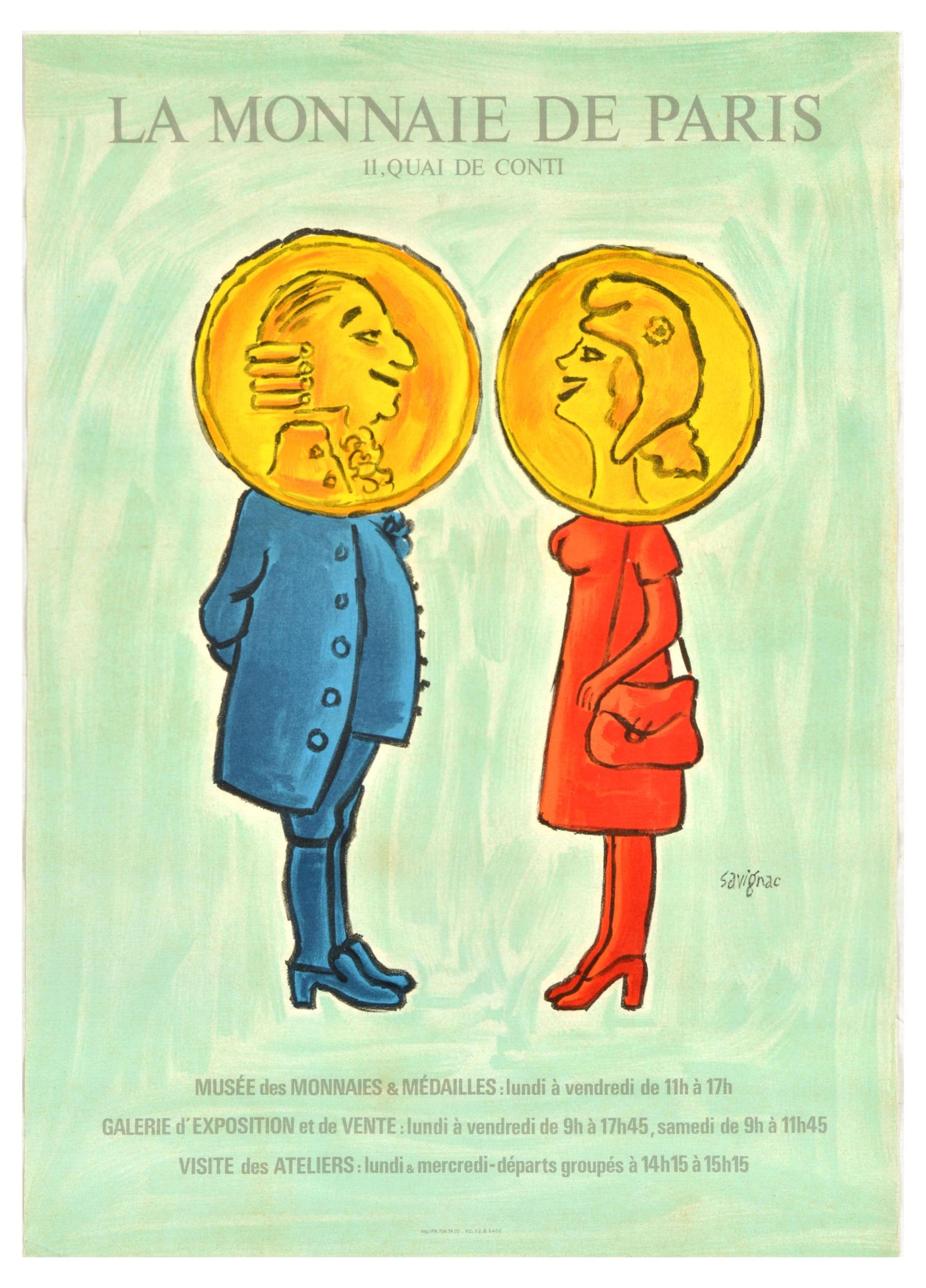 Advertising Poster Paris Mint La Monnaie Die Paris. Original vintage advertising poster for Paris Mint / La Monnaie de Paris, featuring a fun and colourful image by the notable French graphic artist and poster designer, Raymond Savignac (1907-2002), depicting a gentleman and a lady with golden coins for heads set over a green background, with Museum of Coins and Medals, galery, exhibition, and workshop opening hours below. Founded in AD 864 by King Charles the Bald with the Edict of Pistres, the Monnaie de Paris is a government-owned institution responsible for producing France's coins. It is the oldest continuously running minting institution and one of the oldest extant companies in the world. Good condition, creasing, staining, bumps on edges. Country of issue: France, designer: Savignac, size (cm): 53x39, year of printing: 1981.