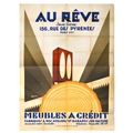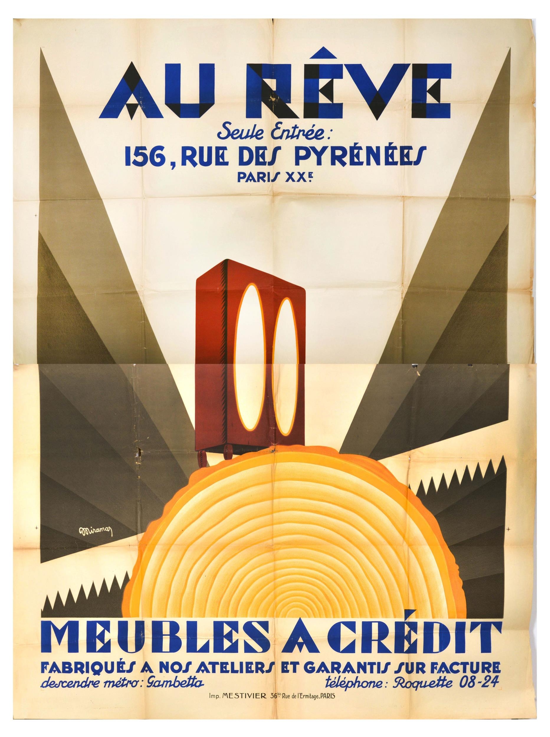 Advertising Poster Meubles Furniture Credit Art Deco Au Reve . Original vintage advertising poster for Au Reve Meubles a Credit - furniture on credit, featuring a great Art Deco illustration depicting a large two-door wardrobe on a log of wood with a saw, the caption reads the address 156 Rue des Pyrenees Paris, phone number and a guarantee - manufactured in our workshops and guaranteed on the invoice. Printed by Mestivier, Paris. Large size. Fair condition, folds, tears, paper losses, creasing, staining, 2 sheet poster. Country of issue: France, designer: Miramar, size (cm): 250x184, year of printing: 1930s.