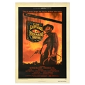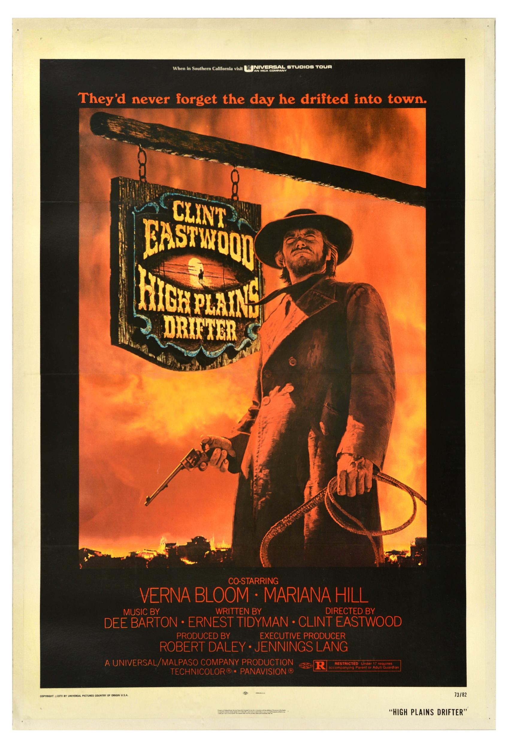 Movie Poster High Plains Drifter Clint Eastwood Western. Original vintage movie poster for High Plains Drifter - a 1973 American Western film directed by and starring Clint Eastwood and co-starring Verna Bloom and Mariana Hill with music by Dee Barton - Design features Eastwood as a mysterious stranger holding a gun and a lasso standing under a wooden sign with a fiery orange sky in the background. The tagline above reads: They'd never forget the day he drifted into town. Good condition, restored folds, minor creasing, backed on linen, pinholes on linen. Country of issue: USA, designer: Unknown, size (cm): 104x69, year of printing: 1973.