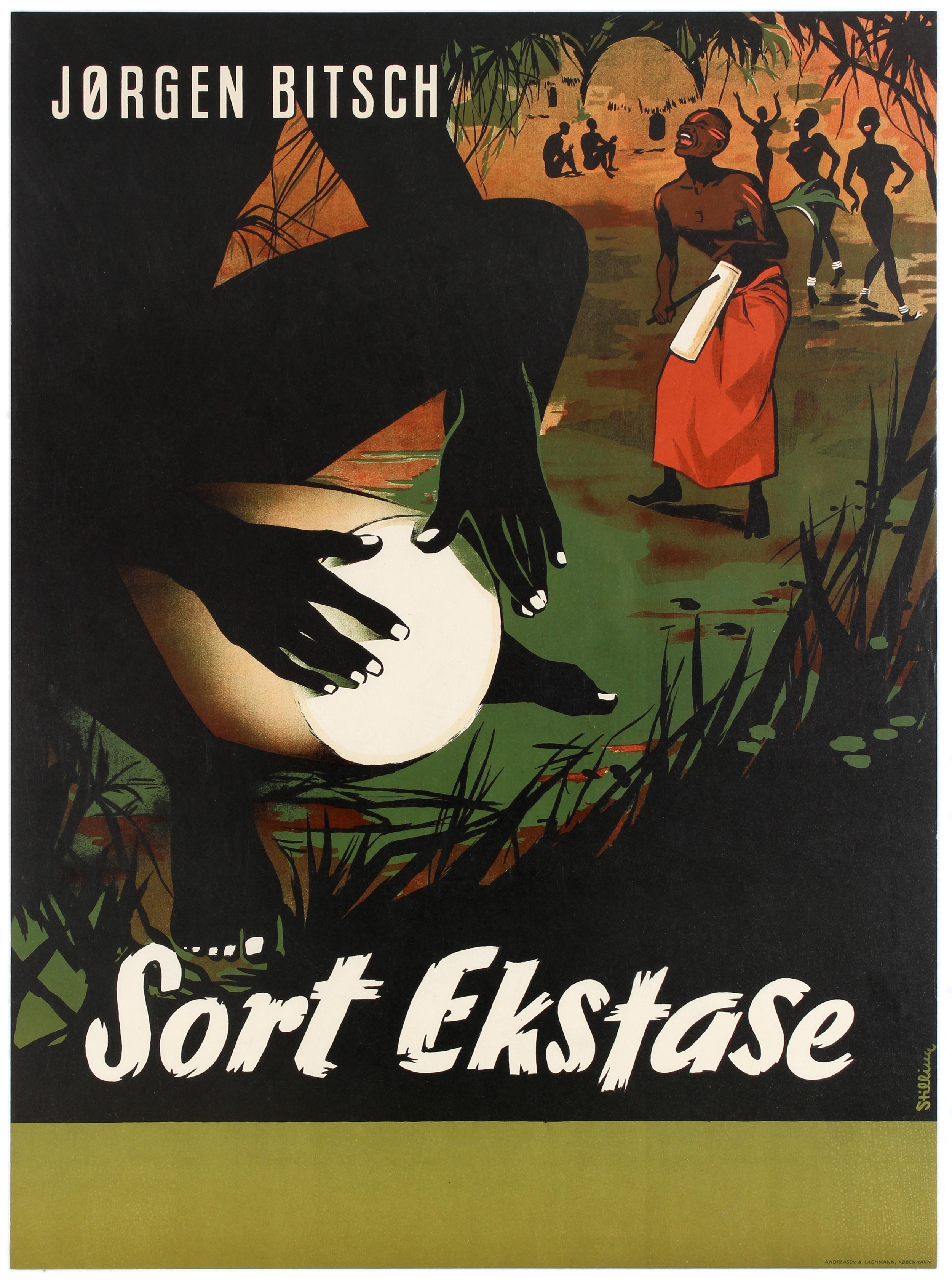 Film poster Black Ecstasy Africa Documentary Jorgen. Original vintage movie poster for a documentary film Sort Ekstase (Black Ecstasy) directed by the Danish adventurer, author, lecturer and film producer Jorgen Bitsch (1922-2005) about his expedition trips in Africa. Striking artwork depicting the hands of an African man playing a drum in the foreground with more people singing and dancing in the background, framed with trees and grass with the text above and below in stylised white letters. Printed in Denmark by Andreasen & Lachmann, Copenhagen. Excellent condition. County: Denmark, year of printing:1955, designer: Stilling, size (cm): 85x62