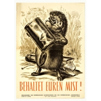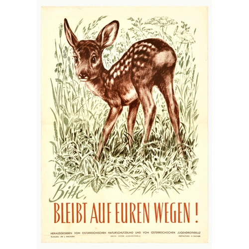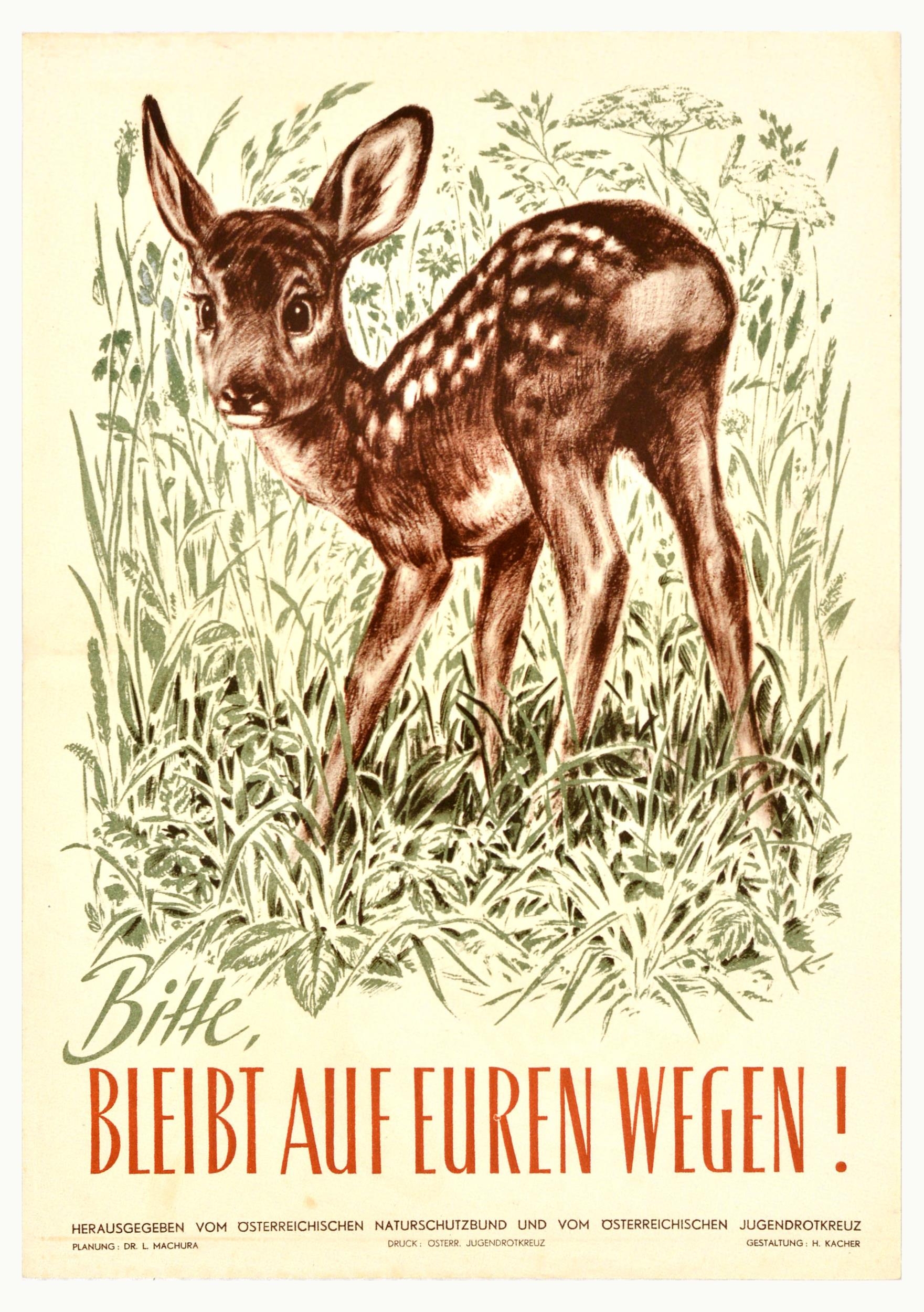 Propaganda Poster Environment Protection Nature Conservation Deer. Original vintage environmental and nature conservation propaganda poster - Please stay on your path! / Bitte, bleibt auf euren wegen! - featuring an illustration of a fawn in tall grass. Published by the Austrian Nature Conservation Union and the Austrian Youth Red Cross. Printed by the Graphic Teaching and Shipping Institute in Vienna VII, as a contribution to the work of the JRK. Good condition, fold, minor staining, minor creasing. Country of issue: Austria, designer: H. Kacher, size (cm): 43x30, year of printing: 1960s.