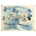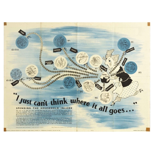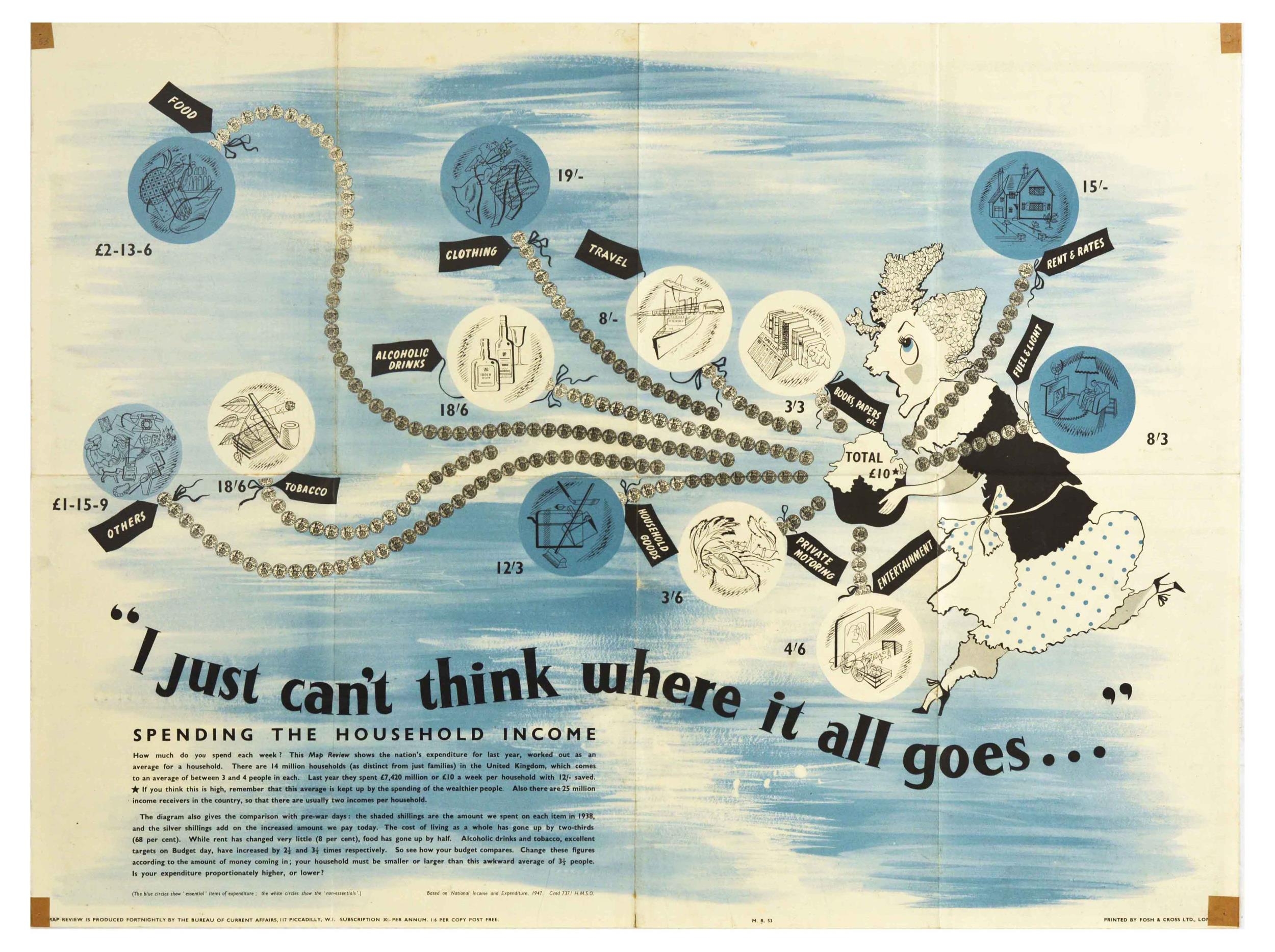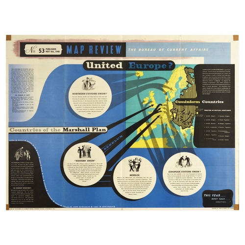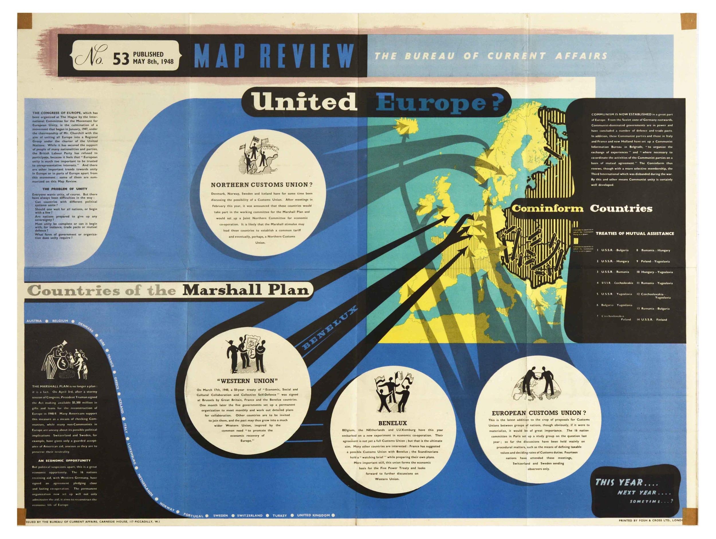 Propaganda Poster Map Review 53 United Europe Spending Income. Original vintage propaganda poster Map Review No 53 Published May 8th 1948, featuring an article titled United Europe? on the Congress of Europe in Hague; Northern Customs Union of Denmark, Norway, Sweden, and Iceland taking part in the working committee for the Marshall Plan; Western Union and Benelux; European Customs Union; and treaties of mutual assistance. The reverse of the poster features an article Spending the Household Income captioned 'I just can't think where it all goes', with a map of Great Britain in a shape of a running lady and the spending portrayed over balloons attached on schilling coin ropes, with blue balloons depicting essential items of expenditure, the white - the non-essentials, lighter coins depicting post-war and darker the pre-war spending. Issued by The Bureau of Current Affairs, Carnegie House, 117 Piccadilly, W.1. Printed by Fosh & Cross, Ltd, London. Horizontal. Good condition, folds, creasing, tears, foxing, pin holes, tape on corners, minor staining, double sided. Country of issue: UK, designer: Unknown, size (cm): 76x102, year of printing: 1948.