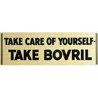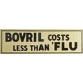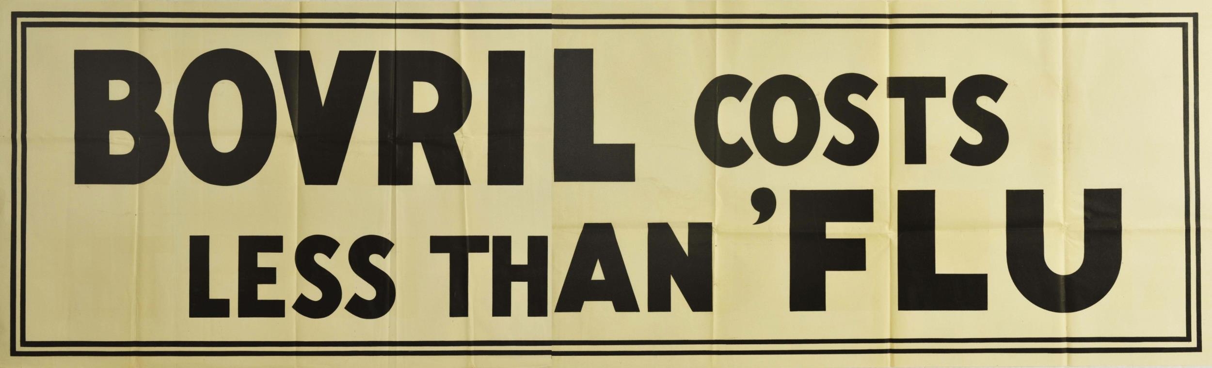 Advertising Poster Bovril Beef Hot Drink Costs Less Flu. Original vintage food advertising poster for Bovril - Bovril costs less than 'flu - featuring bold black lettering on a white background in a double line black frame border. Printed in Britain in the 1930s, this campaign used puns and word play to resemble the public announcement / propaganda posters of the time. Developed by John Lawson Johnston in the 1870s, Bovril is a beef meat extract paste often used to make a hot drink or added as a flavour to stews and soup recipes when cooking or as a spread. Horizontal. Large size. Good condition, folds, tears, staining, creasing, two sheet poster. Country of issue: UK, designer: unknown, size (cm): 56x172, year of printing: 1930s.