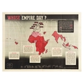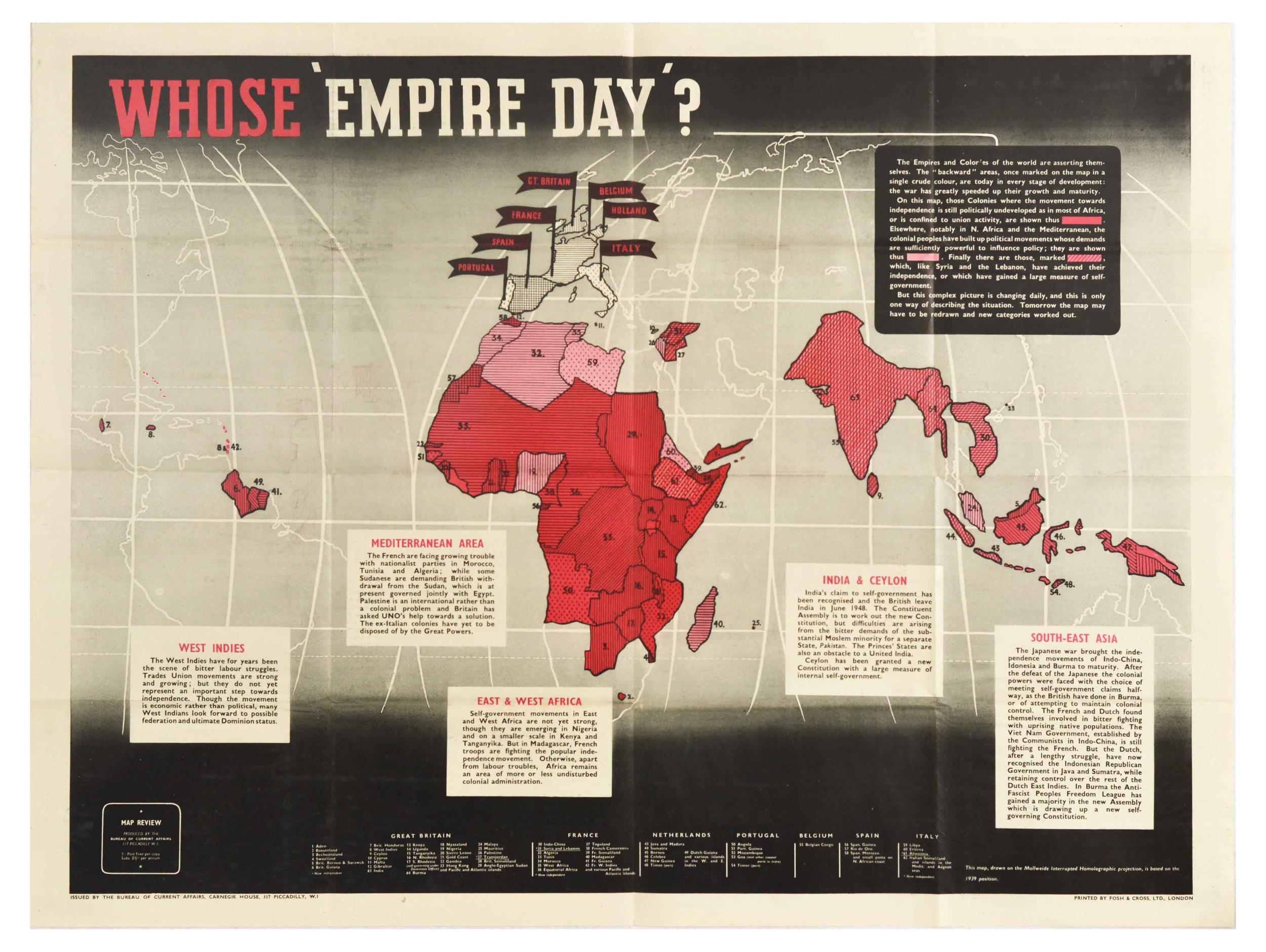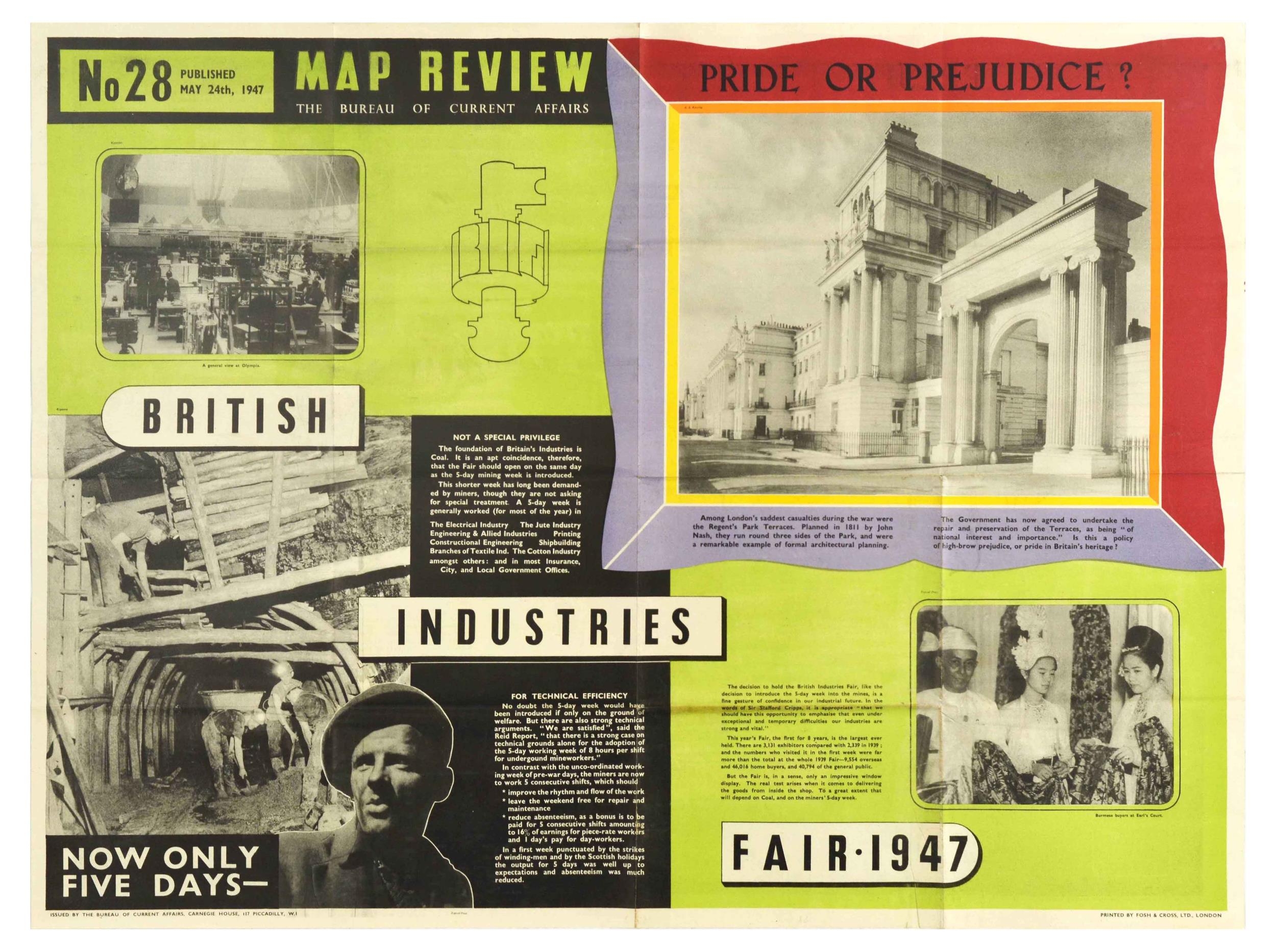 Propaganda Poster Map Review 28 Mining Week British Industries Fair Colonies. Original vintage propaganda poster Map Review No 28 Published May 24th 1947 by the Bureau of Current Affairs featuring articles on British Industries Fair 1947 opening the same day that a 5-day mining week was introduced, with photos of miners and Burmese buyers at Earl's Court; an article on the Government agreeing to undertake the repair and preservation of the Regent's Park Terraces. The reverse of the poster features an article titled Whose 'Empire Day'? with a map of the world marking the Empires and Colonies of the world, with insets on West Indies, Mediterranean Area, East & West Africa, India & Ceylon, and South-East Asia, with a list below the image of Great Britain, France, Netherlands, Portugal, Belgium, Spain, Italy and the countries under their rule. Issued by The Bureau of Current Affairs, Carnegie House, 117 Piccadilly, W.1. Printed by Fosh & Cross, Ltd, London. Horizontal. Good condition, folds, creasing, double sided. Country of issue: UK, designer: Unknown, size (cm): 76x102, year of printing: 1947.