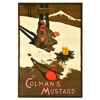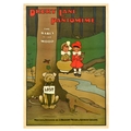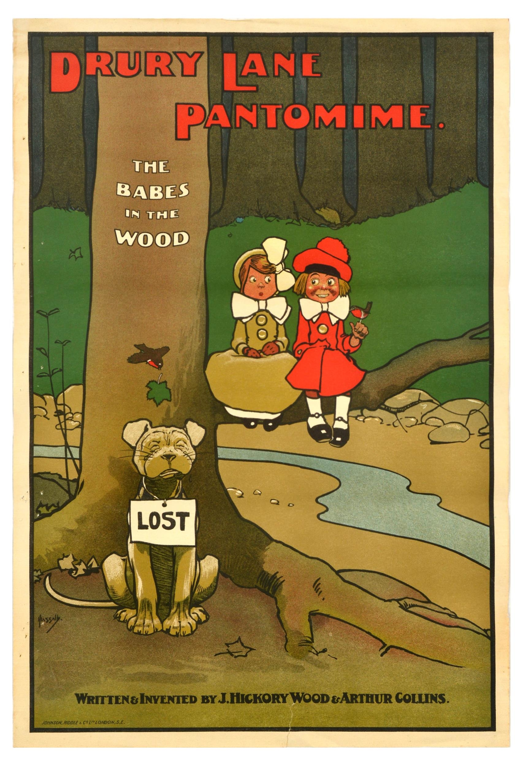 Advertising Poster Babes In The Wood Dog Drury Lane Pantomime . Original antique theatre poster for a Drury Lane Pantomime show The Babes in the Wood, written and invented by the playwrights J. Hickory Wood and Arthur Collins. Colourful image by the notable English illustrator, poster designer and cartoonist John Hassall (1868-1948) depicting two puppet-style characters sitting on a tree branch alongside a lost dog and a robin holding a leaf. Traditional Christmas pantomimes have been held at the Drury Lane Theatre in Covent Garden, London, since the early 1700s. Fair condition, creasing, tears, staining, pinholes. Country of issue: UK, designer: John Hassall, size (cm): 76x51, year of printing: 1900s.
