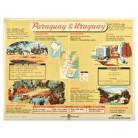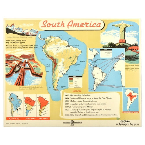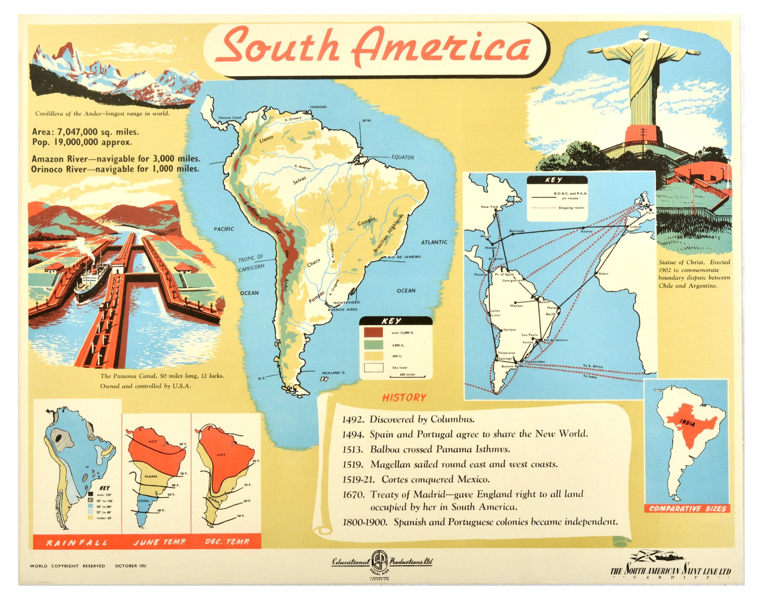 Travel Poster South America Andes Christ Redeemer Map Educational Productions. Original vintage travel poster for Brazil featuring illustrations depicting Cordillera of the Andes - the longest range in the world, the Panama Canal, Statue of Christ, erected in 1902 to commemorate the boundary dispute between Chile and Argentine, with the statistics on the area, population, climate, major history and government dates, a map showing elevation above sea level and a map showing the BOAC and PAA air routes and shipping routes. Educational Productions Ltd. The South American Saint Line Ltd Cardiff. Horizontal. Very good condition, minor staining, minor creasing. Country of issue: UK, designer: Unknown, size (cm): 49x61, year of printing: 1951.