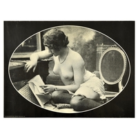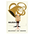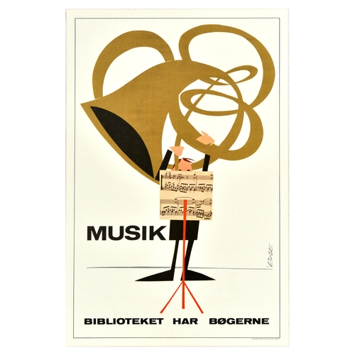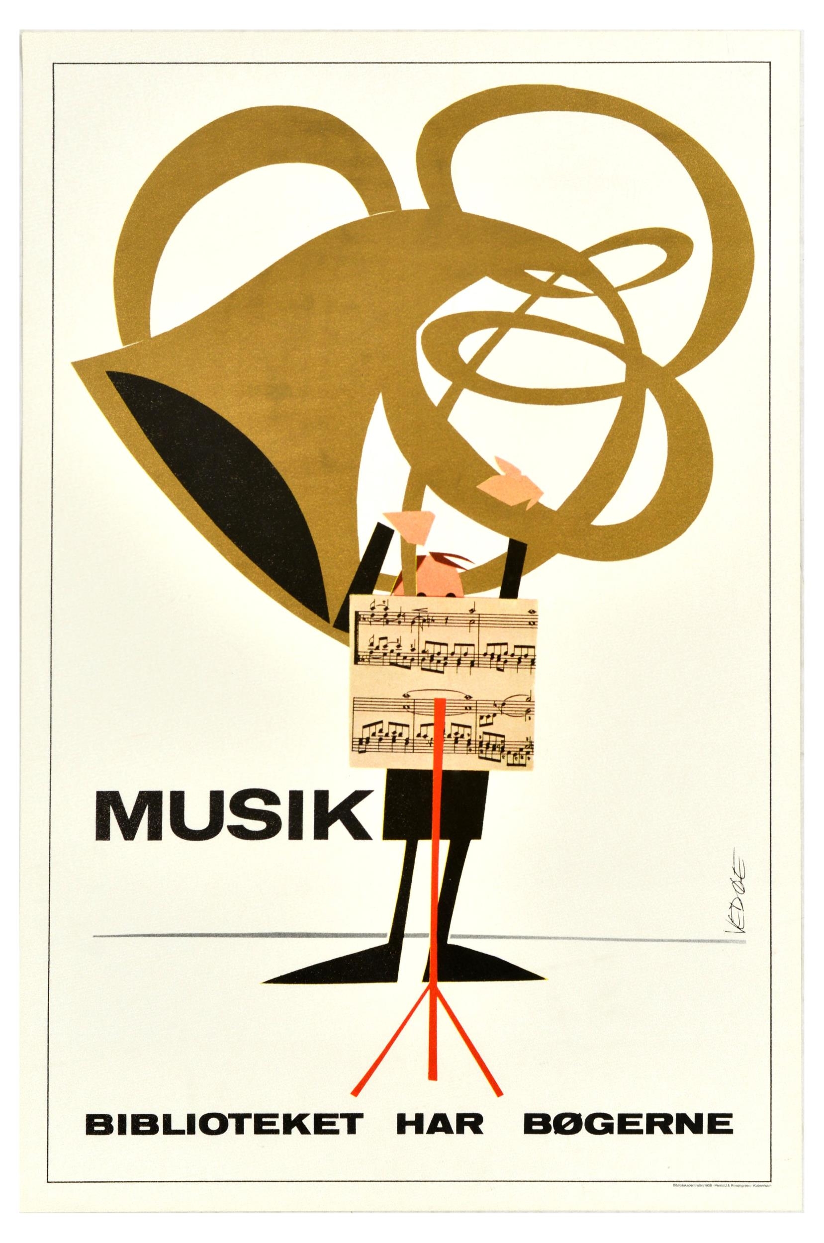 Advertising Poster Music Library Has Books Horn Danish Design. Original vintage advertising poster Musik Biblioteket Har Bogerne / The Music Library Has the Books, featuring an illustration of a silhouette behind a music sheet holding onto a horn set over a white background. Excellent condition, glossy finish. Country of issue: Denmark, designer: Vedoe, size (cm): 60x40, year of printing: 1969.
