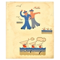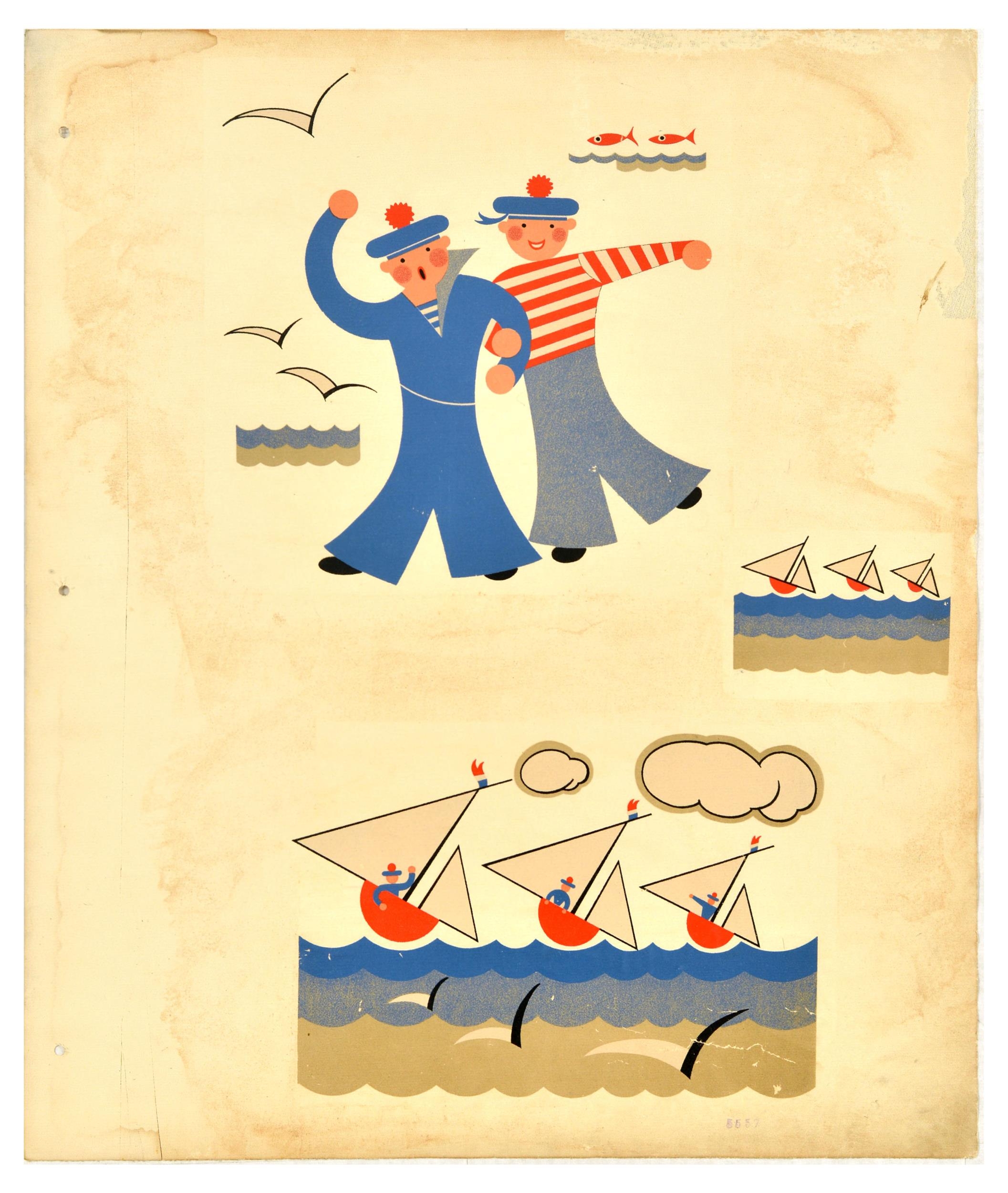 Travel Poster Sailors Navy Sailing Boat Art Deco Wallpaper. Original vintage wallpaper printing sample poster featuring a fun caricature illustrations of two sailors walking hand in hand, with seagulls and fish, and smaller images of sailing boats on the sea. Fair condition, staining, tears, creasing, punched holes on left side, left side cut off and reattached with tape, paper losses, paper skimming, backed on old linen. Country of issue: France, designer: unknown, size (cm): 65x55, year of printing: 1930s.