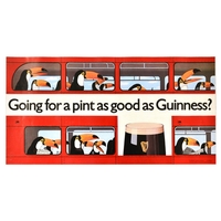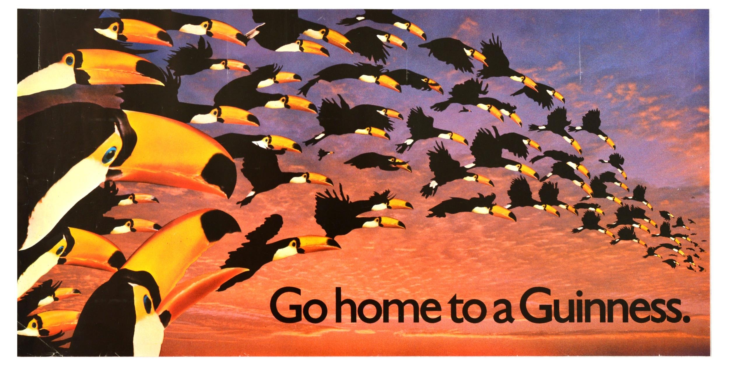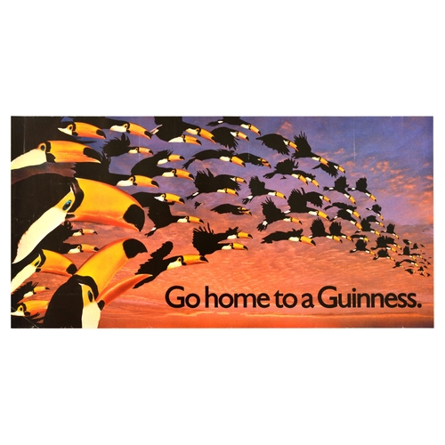 Advertising Poster Go Home To A Guinness Toucans Irish Stout Beer. Original vintage advertising poster for an Irish dry stout Guinness featuring an illustration of a flock of toucans flying on the horizon set over a pink and purple sunset sky, the caption reads - Go home to a Guinness. Horizontal. Good condition, creasing, crease marks. Country of issue: UK, designer: unknown, size (cm): 38x76, year of printing: 1990s.