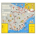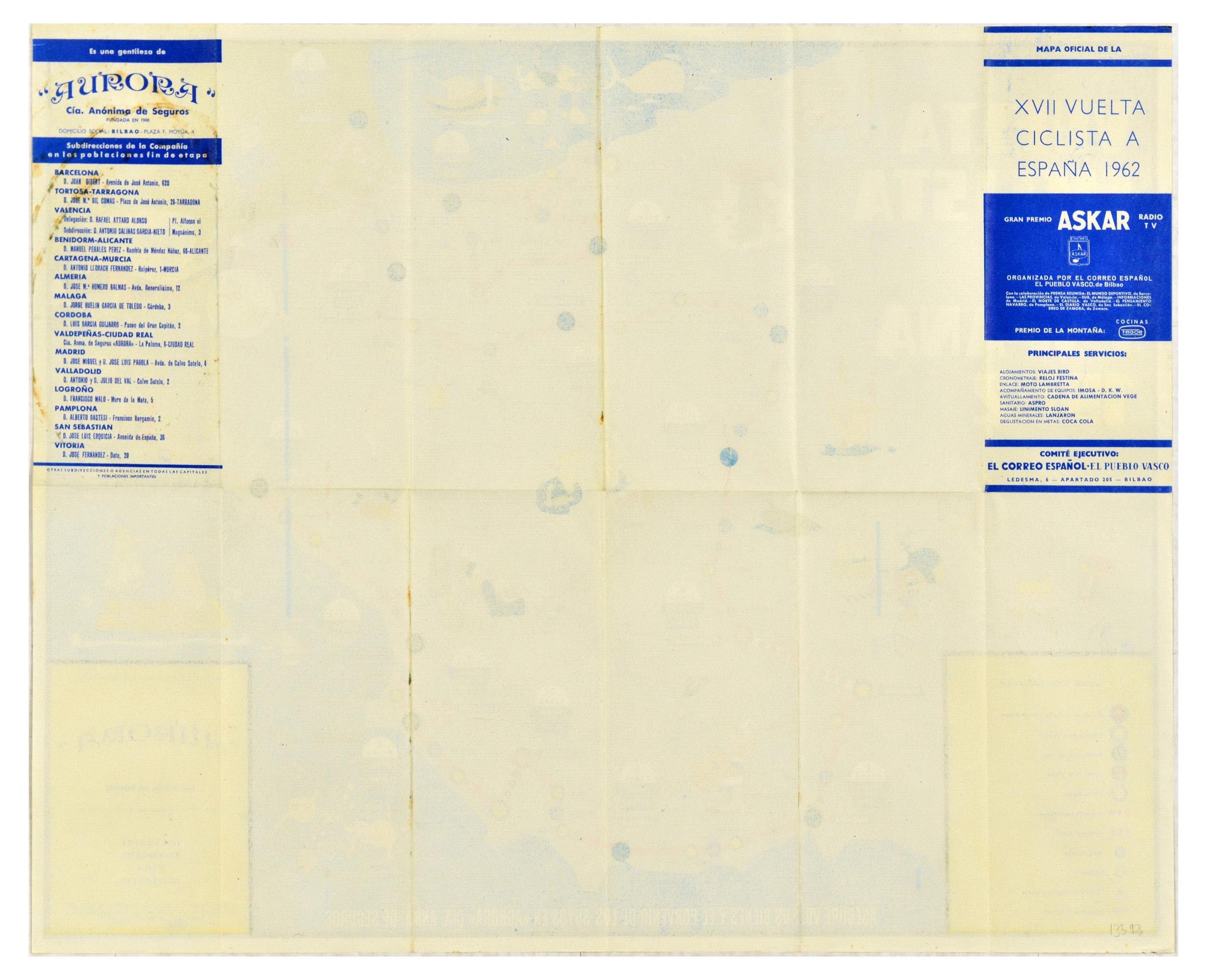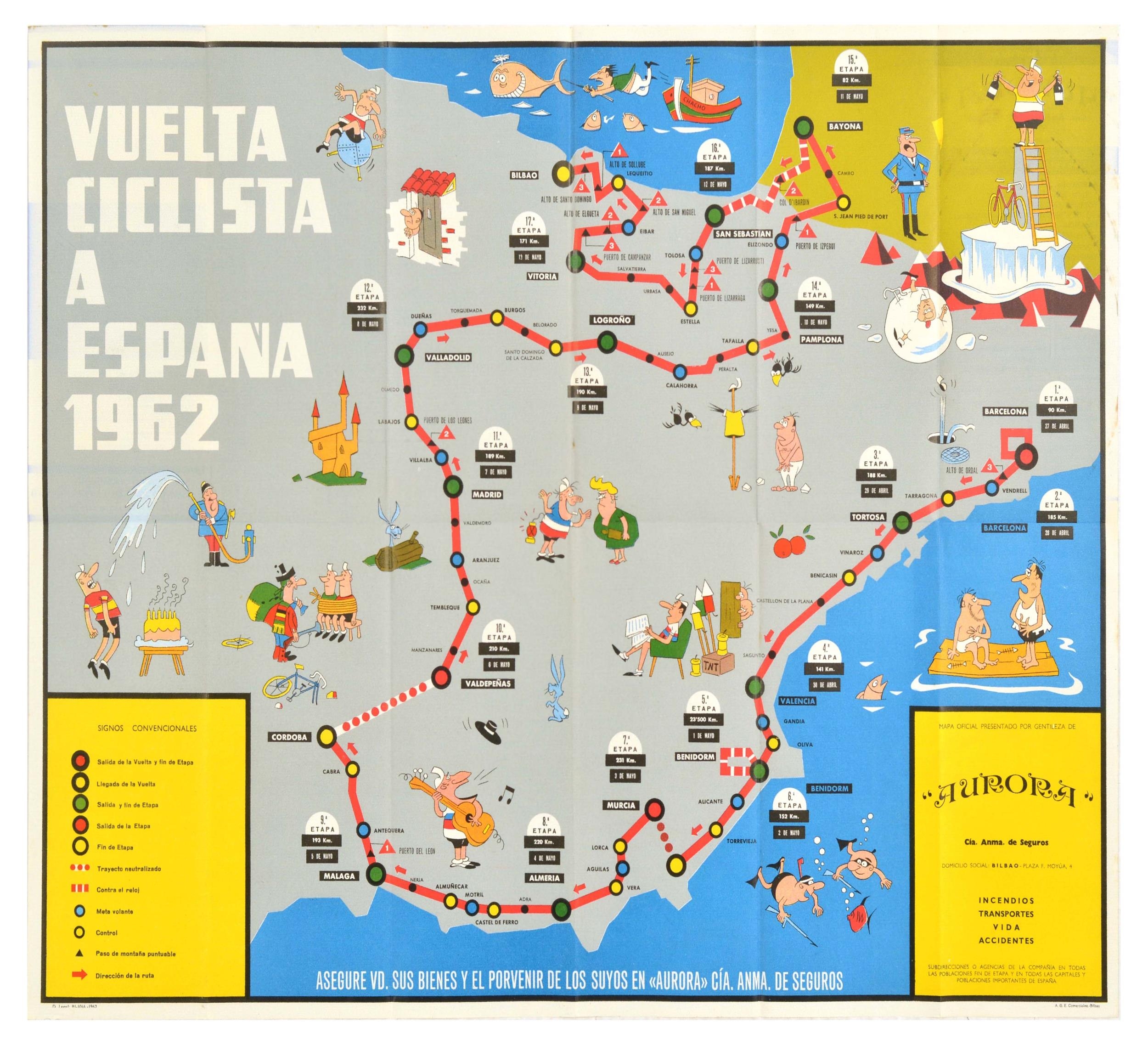 Sport Poster Vuelta Ciclista Tour Of Spain Cycling 1962. Original vintage illustrated map poster for the Vuelta Ciclista A Espana 1962 showing the cycling route of the 1962 Tour of Spain marked as a red line with information on the distances and colourful cartoon-style images along each stage of the race including two men stranded at sea on a raft, underwater fishermen spearfishing, a man playing music on a guitar and singing, kidnapped cyclists, children with fireworks. Good condition, folds, minor staining. Country of issue: Spain, designer: unknown, size (cm): 56x71, year of printing: 1962.
